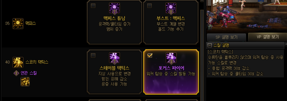 실전에서는 데미지 효율이 낮은 스코치택틱스를 버리고, 스킬을 빠르게 쓸 수 있는 스킬 위주로 찍습니다.
