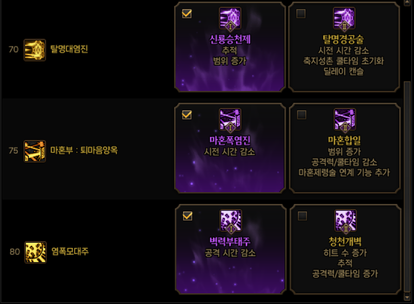 이 중에 필수라고 생각되는 부분은 75제 마혼부 : 퇴마음양옥의 시전 시간 감소이며,
