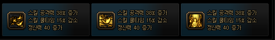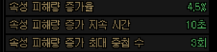 지속 시간이 5초 증가합니다. 한번 깔아두면 오랜 시간 동안 몹을 타격할 수 있어 속성 피해량 증가 버프를 묻히기 좋습니다. 또 회피율 20%도 쏠쏠해서 레이드를 갈 때 사용하고 있습니다. | 공격시간이 감소됩니다. |