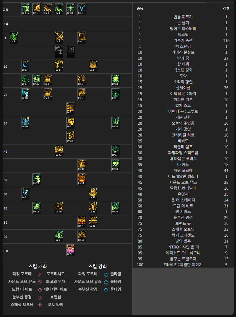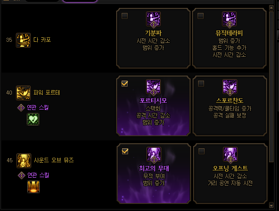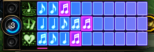 스킬창을 보시면 파워랑 그루브 시전 시 일부 스킬이 4분음표/8분음표/16분음표로 변하며 악보를 칠 수 있게 됩니다.