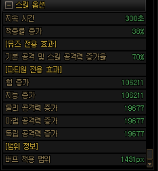 VP 추가효과:[럭키 크레센도] 범위 증가 버프 5% 증가/ 지속 시간 20초 증가