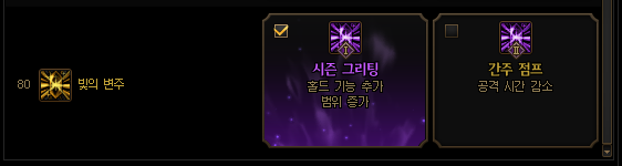 | 착지 위치를 지정할 수 있게 바뀌고 10%의 HP/MP 증가 효과가 생깁니다. | 파티원 속도 증가 10% 버프 및 몹몰이 기능이 생깁니다. |