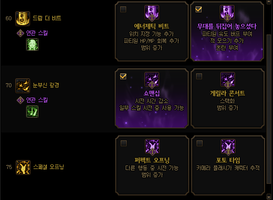사운드 오브 뮤즈 사용 중 쇼맨쉽을 사용 가능합니다. 위에 설명한 10칸 신수력 회복 콤보에 이용되기 때문에 채용합니다. | 3회 스택 스킬로 변경되며 신수력 스택 회복도 3칸에서 2칸으로 변경됩니다. 신수력 회복 관점에서 보면 좋은데 실제로 사용해보면 시전시간이 거슬려 저는 채용하지 않았습니다. |