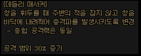 스킬이 깔끔한 단타기로 변하고 공격 범위도 늘어나서 방 하나를 정리하거나 대충 날리기에 좋습니다.