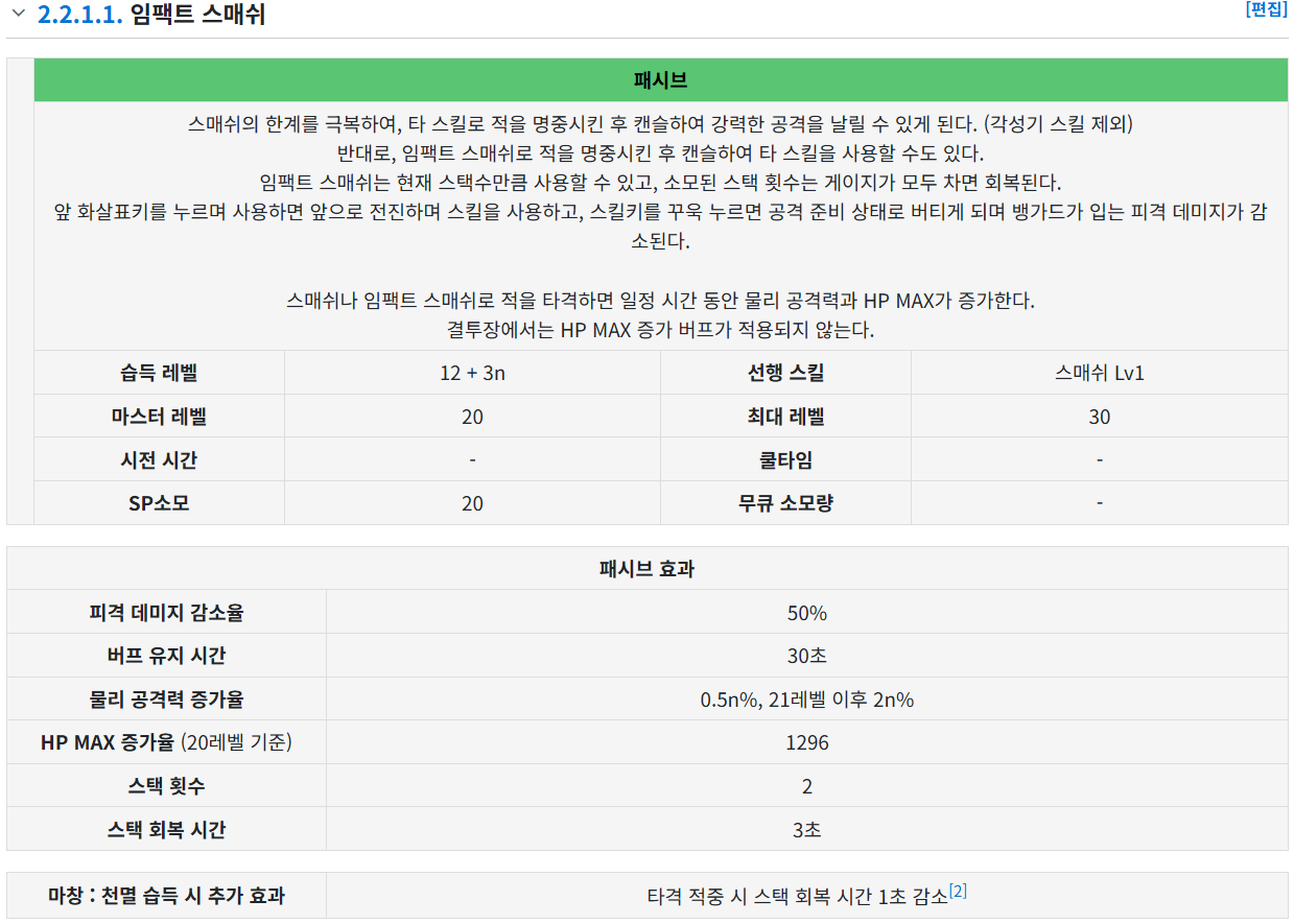 스킬 개화를 통해 임팩트 스매쉬 소모를 줄일 수 있습니다(나중에 후술)