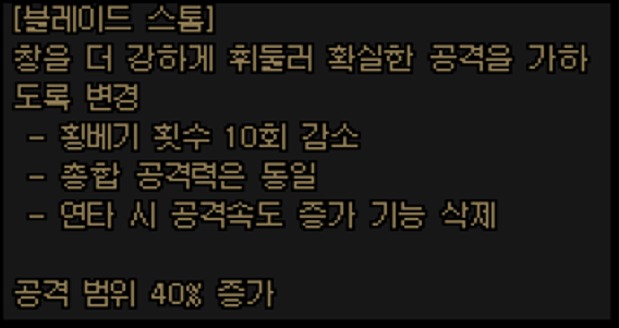 주의할 점은 임팩트 스매쉬 타이밍이 다른 스킬에 비해 많이 변해져서 데미지를 다 넣기전에 캔슬해버릴 수 있으니 창을 3번 휘두른 걸 보고 임스를 사용하면 됩니다.