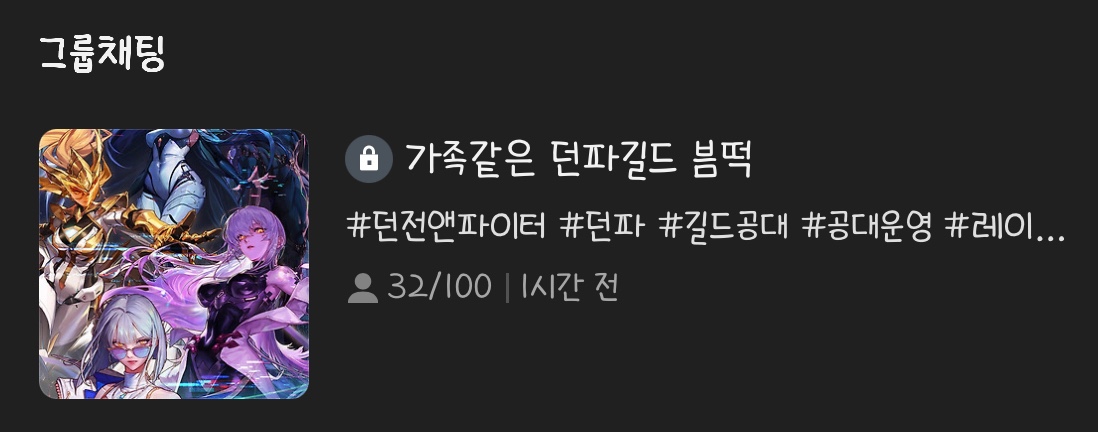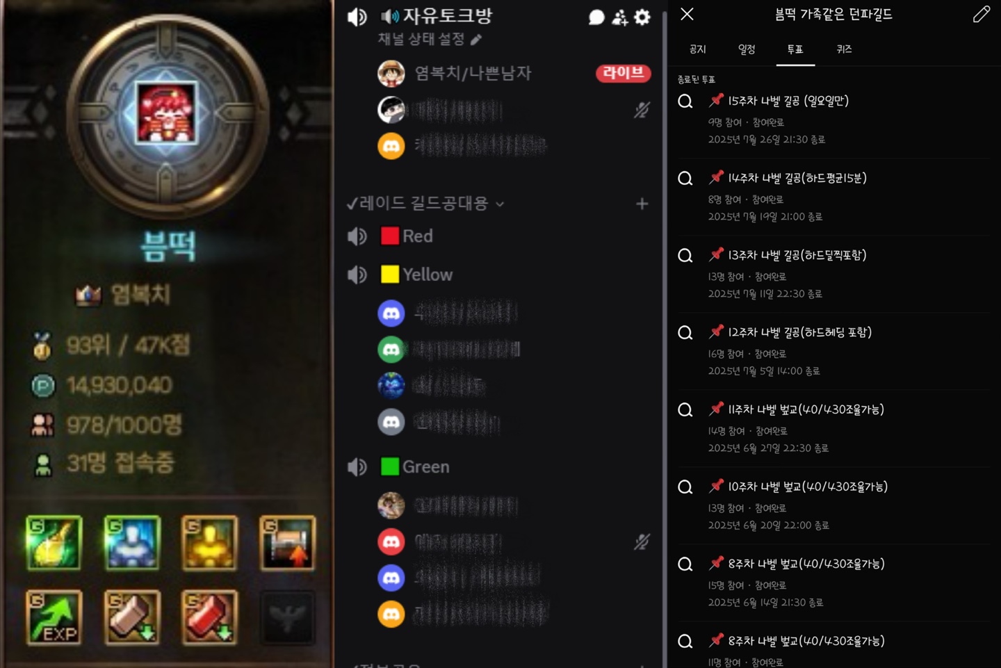 - 디스코드 , 오픈톡방 있으며, 정보공유나 가벼운 사담 및 길드공대 투표할때 사용해요(자율참석)