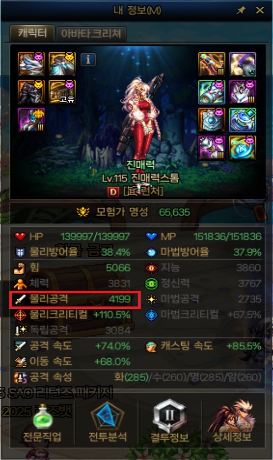 장비 증폭 스탯 변경창 : 지능 여스핏, 여메카 → 여런처 변경시 스탯 ‘힘’ 선택