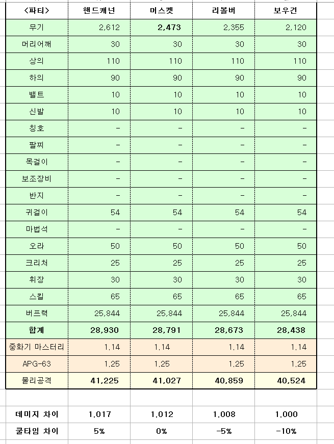 ∴ 파티플레이 시 핸드캐넌 과 보우건의 데미지 차이는 1.7% 정도 매우 작은 차이로 좁혀졌으나 쿨타임 감소 차이가 15% 발생하여 보우건이 여러모로 이득이다.