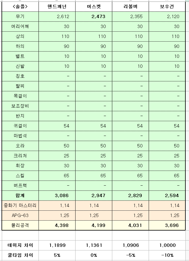 ∴ 솔로플레이 시 핸드캐넌 과 보우건의 데미지 차이는 19.0% 정도 이 차이는 특랜+양자 폭탄 하나 정도 스킬 차이가 난다고 보면 되고,