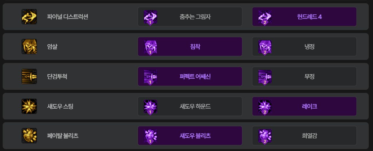 - [단검투척 → 파이널 디스트럭션 → 암살 → 페이탈 블리츠 → 단검뽑기] → [섀도우 스팅 → 죽음의 연무] → 그림자 이동 → 메니싱 시즈 → 코버트 액션 → 심장 찌르기