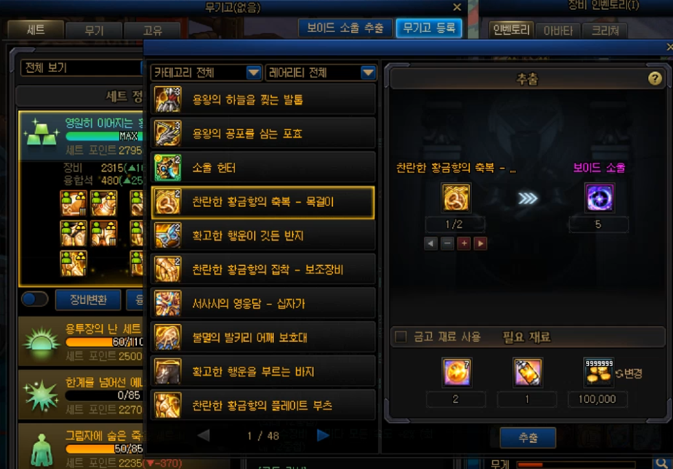 무기고에 있는 중복된 에픽 장비를 보이드 소울로 변환해 줍니다.