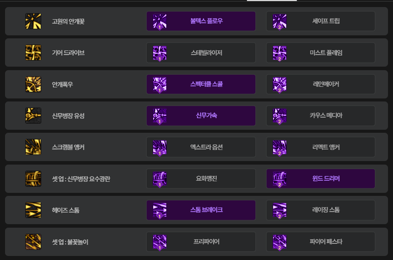 - 셋업 > 안개 무리 > 가랑비 > 네뷸라 > 불꽃놀이 > 안개꽃 > 기어 드라이브 > 요수광란 > 헤이즈 스톰 > 안개폭우