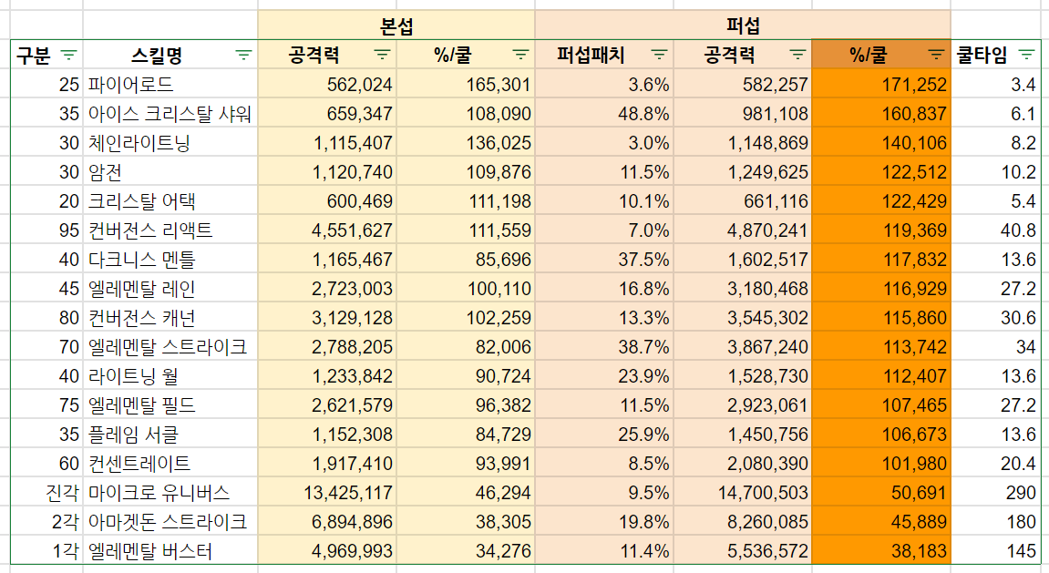 - 위 표는, 스킬의 전체 데미지를 쿨타임으로 나눠서, 쿨타임 대비 딜의 효율이 얼마나 좋은지 나타냅니다.
