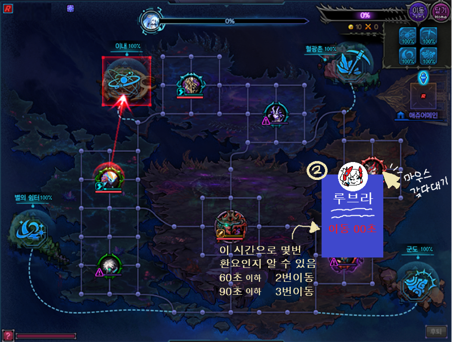 3. 2번이동 환요오괴 : 마우스 커서 올려서 '이동 00초'가 60초 이하