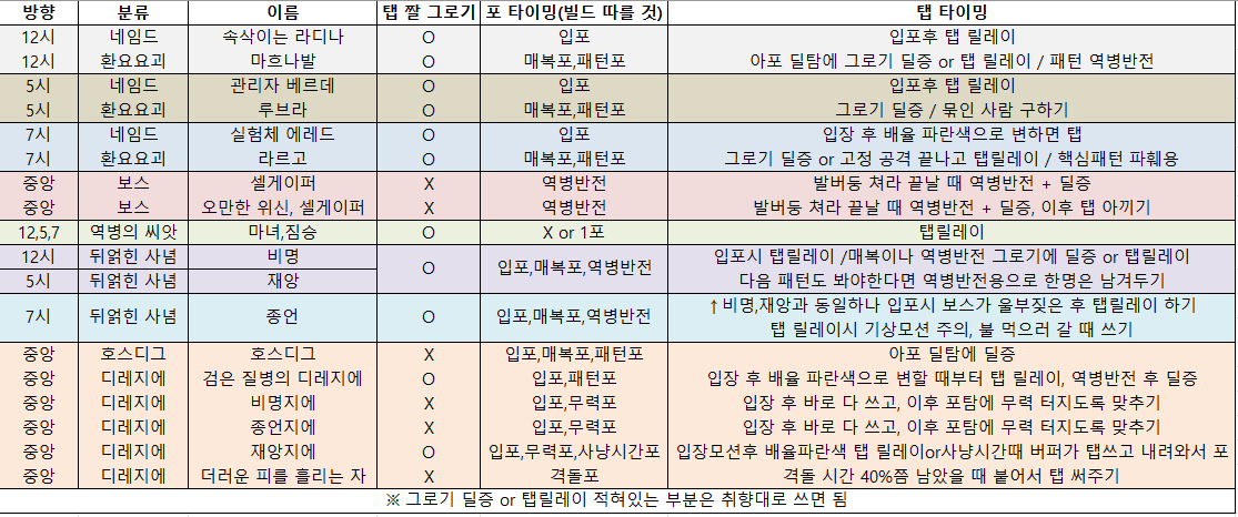 공지 [상시이벤트] 12월 묻고답하기 이벤트 안내 (11월 답변왕 발표) (10) 던전앤파이터 2025.12.11 2,654 0 공지 [수상자 발표] [월드보스] 정보/공략 작성 이벤트 수상자 안내 던전앤파이터 2025.12.04 3,391 0 공지 [이벤트] [디레지에] 레이드 정보/공략 작성 이벤트 던전앤파이터 2025.11.26 7,555 1 공지 2025 던파페스티벌 20th Anniversary 발표 요약 던전앤파이터 2025.11.22 207,191 22 공지 장비 / 플레이 / 뉴비 정보 모음 (219) 던전앤파이터 2025.04.24 999,999+ 115 공지 던전 공략 모음 (디레지에 레이드) (176) 던전앤파이터 2025.11.26 999,999+ 138 공지 전직 별 가이드 모음 (25/11/24 갱신) (745) 던전앤파이터 2025.11.24 999,999+ 391 팁 [공통] 디레지에 220/600 벞교 빌드 다두 (17) 다시다뎌 2025.12.17 1,401 0 팁 [공통] 디레지에 레이드 패턴 공략 (51) Sanso 2025.12.17 8,851 66 팁 [무녀] 여프리스트 전직 무녀의 스킬트리,vp,스킬강화,운용가이드 (2025년최신) 뚜룹이헤카테 2025.12.16 932 3 팁 [공통] 디레지에 레이드 핵심 재화 정리 (17) 겨울동화 2025.12.16 7,066 13 팁 [버서커] 세상에 나쁜 버또는 없다. MZ버서커 올바르게 키우기(스킬 밸패 추가) (81) 커피 2025.12.16 134,210 48 팁 [공통] 디레 180/580 무난 안전 빌드 (재앙 디레 스킵) (2) 귀신잡는서루 2025.12.16 654 0 팁 [트래블러] 칠흑 트븜 vp랑 콤보.gif (10) 하이븜 2025.12.16 13,775 3 팁 [공통] 재미로 보는 디레지에 무기 이야기 (6) 말랑무제비 2025.12.16 2,748 14 팁 [공통] 님들아 지금 검은화면 뜨시는분 잘보셈 (2) 임시dnf515713855 2025.12.15 893 1 팁 [로그] 중천 로그 간단 가이드 (120) LuRyu 2025.12.15 76,032 56 팁 [공통] 디레지에 레이드 탭타이밍 & 빌드 정리표 (12/13일자 기준 최신) (13) 힐조 2025.12.15 2,151 13 팁 [여런처] 디레지에는 듀얼트리거와 흰큐계를 씁시다. (9) 여성의진매력 2025.12.15 906 2 팁 [공통] 경매 주화 빠르게 찾는 법 나는돌돔 2025.12.14 754 3 팁 [여레인저] 여레인저의 스킬, 세팅, 운영 (66) 엘수르 2025.12.13 52,676 36 팁 [공통] (영상) 170/570도 가능한 디레지에 빌드 공략!(넉넉하게 스펙 맞춰서 가세요) 관훈 2025.12.13 604 5 팁 [공통] 비밀상점 정리 (2) 츄르모시 2025.12.13 1,155 4 팁 [남스트라이커] (12/12 수정) 패황 핵심만 적어놓은 가이드 (VP/스킬/콤보/사이클/영상) (88) 패는 2025.12.12 153,053 41 팁 [인파이터] 세렌단을 고민하는 모든 인파에게 바칩니다. (6) IZIL 2025.12.12 681 0 팁 [공통] [초간단] 디레지에 공대장 공략, 빌드 +추가팁 (45) 곽묵직 2025.12.12 17,442 21 팁 [공통] 부캐 안키울거양? (496) 예지몬 2025.12.12 357,733 314
