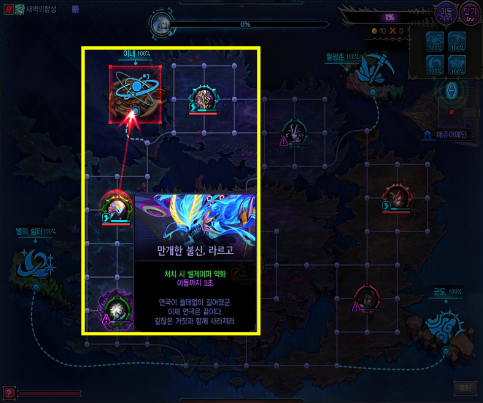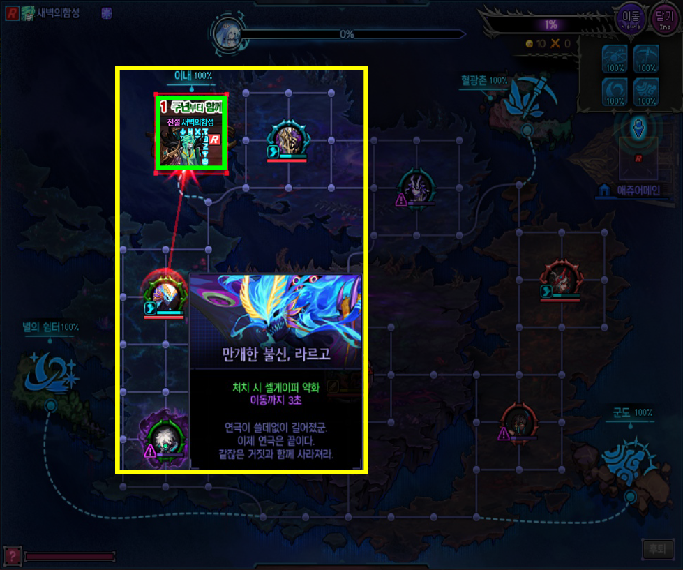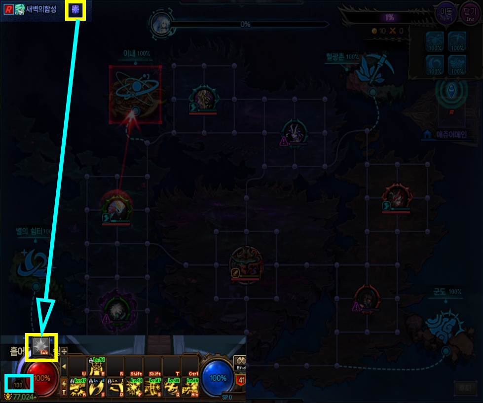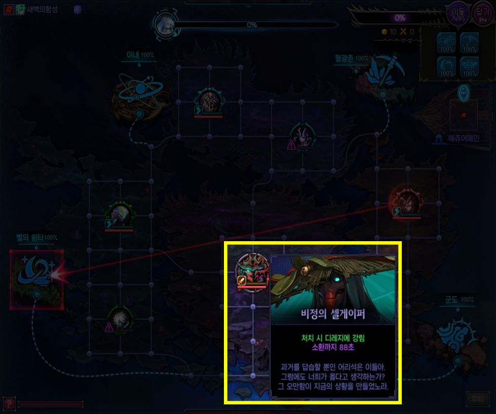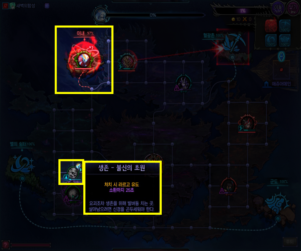 본진 개념의 장소는 상황판 우측 상단의 에쥬어 메인입니다. 레이드 시작시, 전투중 후퇴시 이곳으로 오게 됩니다.