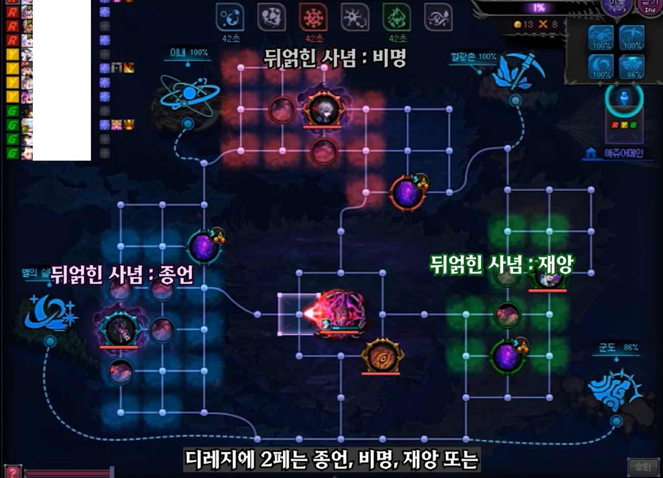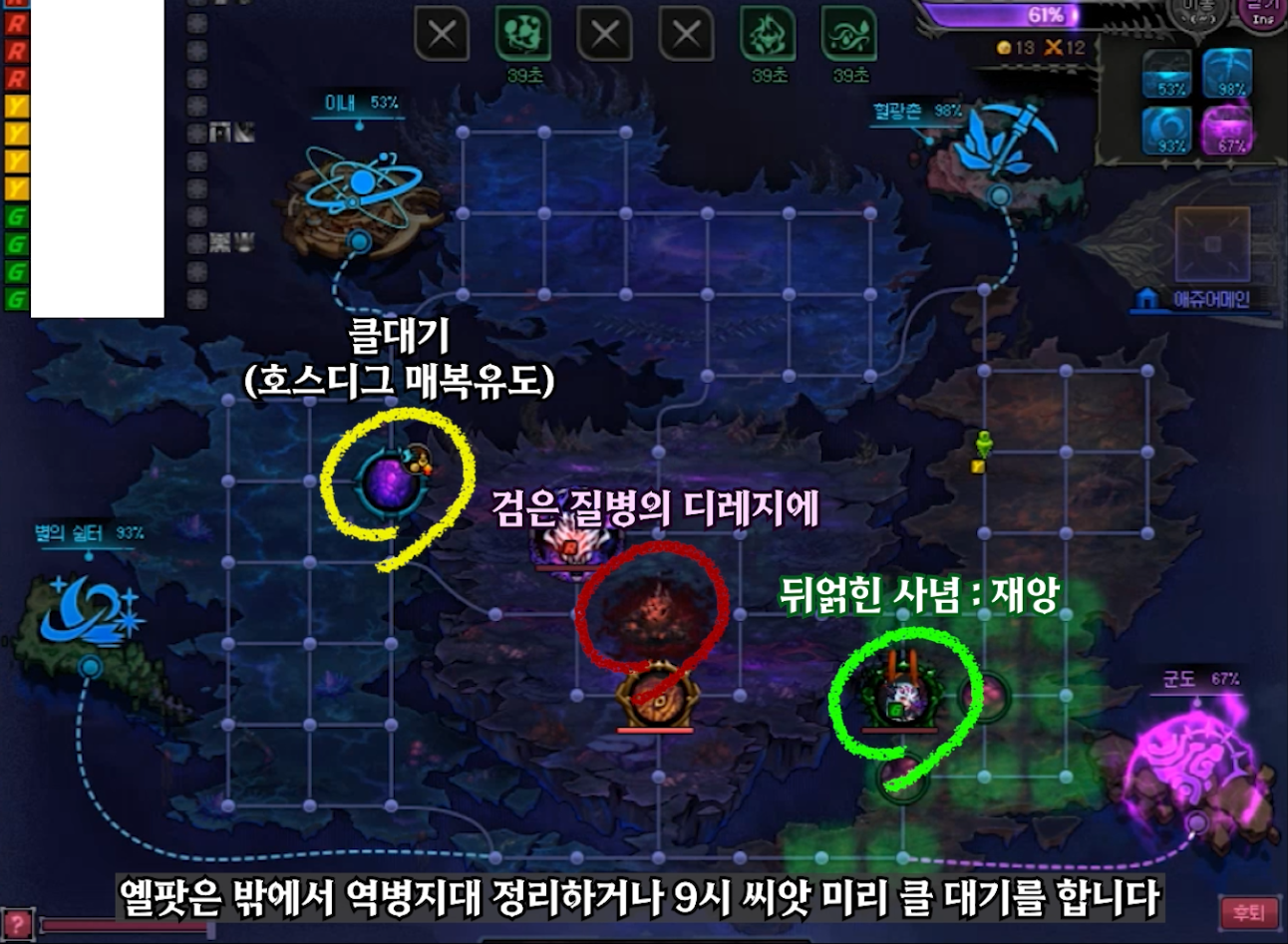 주로 잡는 순서는 종언(9시) -> 비명(12시) -> 재앙(3시) 또는