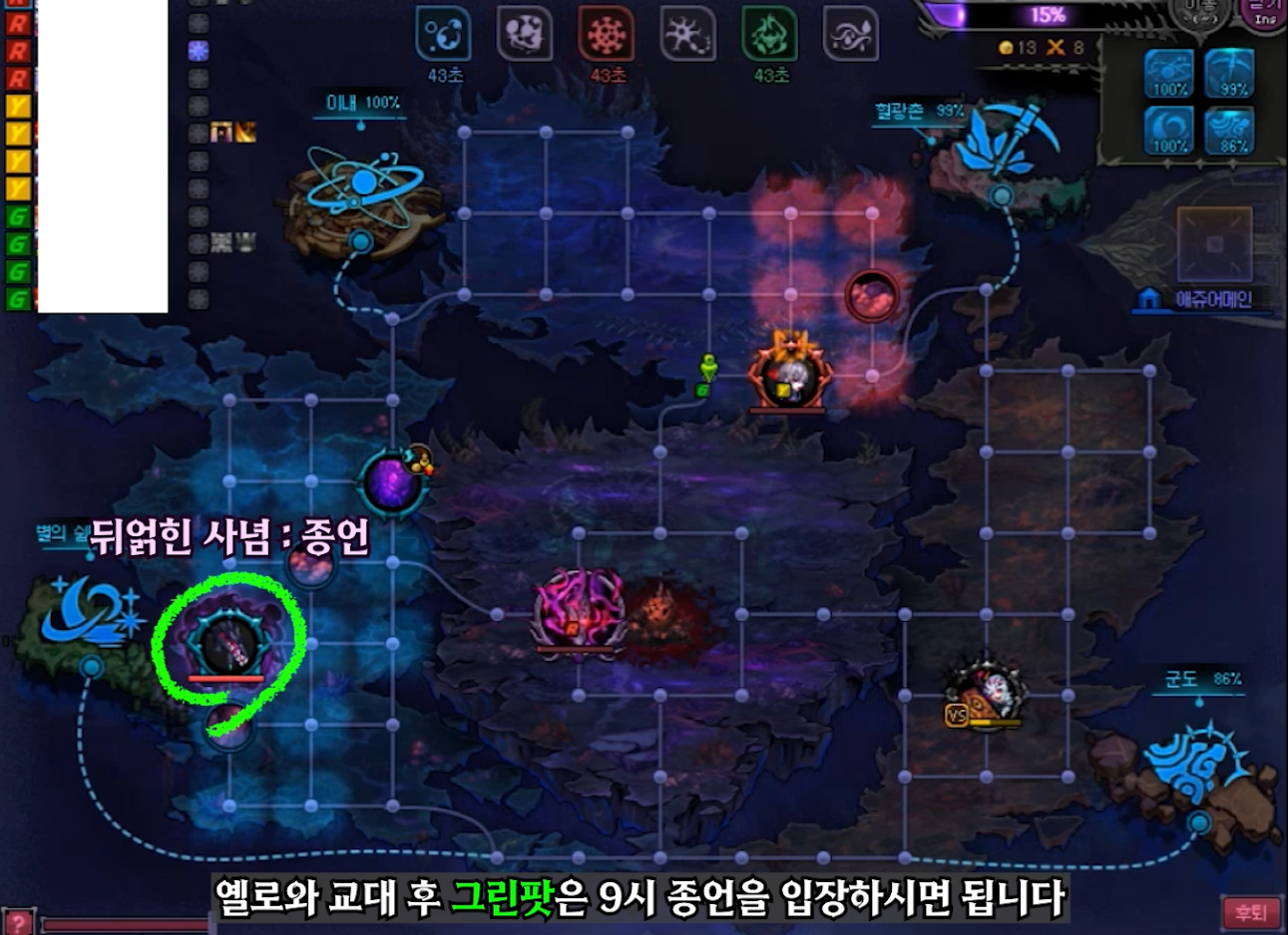 상황 : 옐팟이 씨앗을 처리 후, 그린과 교대한 모습, 그린은 9시 종언 입장 준비