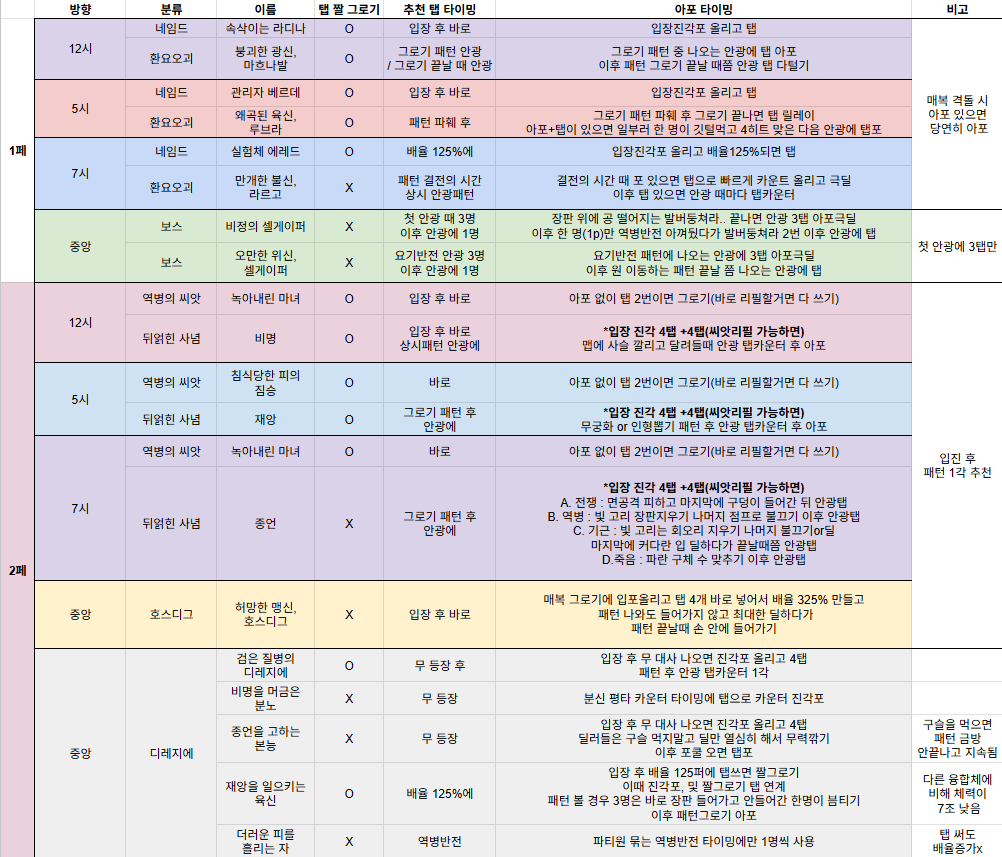 1각or진각있는팟(레드) : 재앙쪽 씨앗밀고 격돌에 탭다털고 1각 이후 패턴안광탭 딜로 클리어(얘는 쉬워서 1각해도 충분)