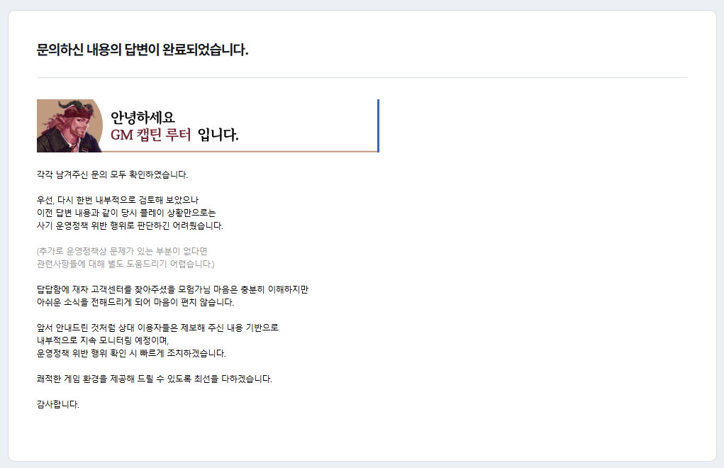 "다시 한번 검토 해봤으나, 사기 운영정책 위반으로 판단이 어렵다" 는 답변입니다.
