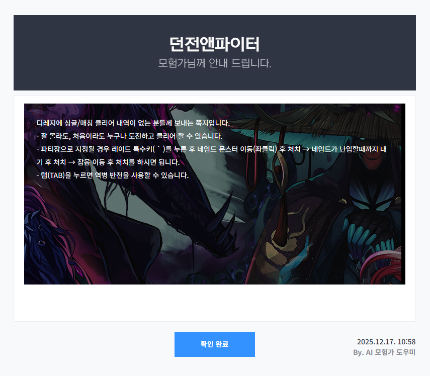 공지 [상시이벤트] 12월 묻고답하기 이벤트 안내 (11월 답변왕 발표) (10) 던전앤파이터 2025.12.11 2,235 0 공지 [수상자 발표] [월드보스] 정보/공략 작성 이벤트 수상자 안내 던전앤파이터 2025.12.04 3,022 0 공지 [이벤트] [디레지에] 레이드 정보/공략 작성 이벤트 던전앤파이터 2025.11.26 7,143 0 공지 2025 던파페스티벌 20th Anniversary 발표 요약 던전앤파이터 2025.11.22 82,401 22 공지 장비 / 플레이 / 뉴비 정보 모음 (219) 던전앤파이터 2025.04.24 999,999+ 115 공지 던전 공략 모음 (디레지에 레이드) (176) 던전앤파이터 2025.11.26 999,999+ 138 공지 전직 별 가이드 모음 (25/11/24 갱신) (745) 던전앤파이터 2025.11.24 999,999+ 389 수다 [공통] [설렘주의보] 길드원 모집중입니다~ (1) 흔들여신 18:00 216 0 수다 [공통] [모집] 븜다닥 & 븜다다닥 길드에서 길드원 모집합니다. <개꿀잼 오픈톡 맛보기 공개> (499) 싑고수 17:57 280,163 26 수다 [공통] [공통] [모집] 속보 : 던파 길드 [소중], 신입 모집 개시 ㄷㄷ (37) 먹츄 17:56 14,216 5 수다 [공통] 쿨감 상한 70%에 캐릭 고유 패시브는 빼줘라 인간적으로 神의恩寵 17:55 15 0 수다 [공통] 헬을 멈추는 기준이 어떻게 되시나요? (2) 월클드랜 17:55 19 0 수다 [공통] ■하와왕&븜니찌와■길원모집! / 나무위키 공식인증길드 TOP20클리어 / 디레지에 길공보유 / 본섭에서함께할 랭커대환영 ! (49) 양초된다실시 17:42 805,678 23 수다 [공통] ★밤나비★ 길드원 모집중// 디레 이내 길공o 단톡디코o 함께하실분을 모십니다. (7) 창단주 17:21 1,613 2 수다 [공통] 너희 게임 못하자나^^ (3) 홍차와사탕 17:11 204 0 수다 [공통] ♡아깽이♡ 길드 집사들 구함니다 =^._.^= (43) churr 17:03 30,627 9 수다 [공통] ◆ 각종 무기형상 팝니다(이미지 포함) ◆ (21) 배추치즈 16:54 13,957 0 수다 [공통] ㅇㅅㅇ (17) 개골개골 16:44 137 2 수다 [공통] 신생길드! ''헐!'' 고인길드 녹아들기 힘드신분들!! /말 많으신 분,활발하신 분 대환영 냥담배 16:40 13,243 2 수다 [공통] 요새 그 뭐지 비늘주는 그 보스잡기 (10) 엘마키울랭 16:34 238 0 수다 [공통] 길드 찾아요~ 설희여우 16:27 84 0 수다 [공통] 20주년 굿즈 부들부들 나이트 타올 이랑 아크릴액자 필요한사람 @@ (10) 十뮤즈十 16:16 464 0 수다 [공통] ...나 정화파밍 왜했지? (3) 神의恩寵 16:11 349 0 수다 [공통] ◎루바토&레가토&테누토 연합길드에서 길드원 모집합니다(나벨,이내 길공 및 헤딩공대 운행중, 디레지에 길공 운영예정) (4) 요도 16:02 19,149 0 수다 [공통] 종민아 진짜 확률 조작이라도 해놨냐 (4) 청븜석 15:54 288 0 수다 [공통] 모험단 꼰대빌런 서버 카시야스 닉네임 꼰대딱총빌런 << 나벨 2클 걍클고, 컷미달 꼬공잡 공대장 (1) 미르히 15:52 576 3 수다 [공통] 태초 이제는 잘 못먹는데 (5) 꽃마녘 15:48 269 0