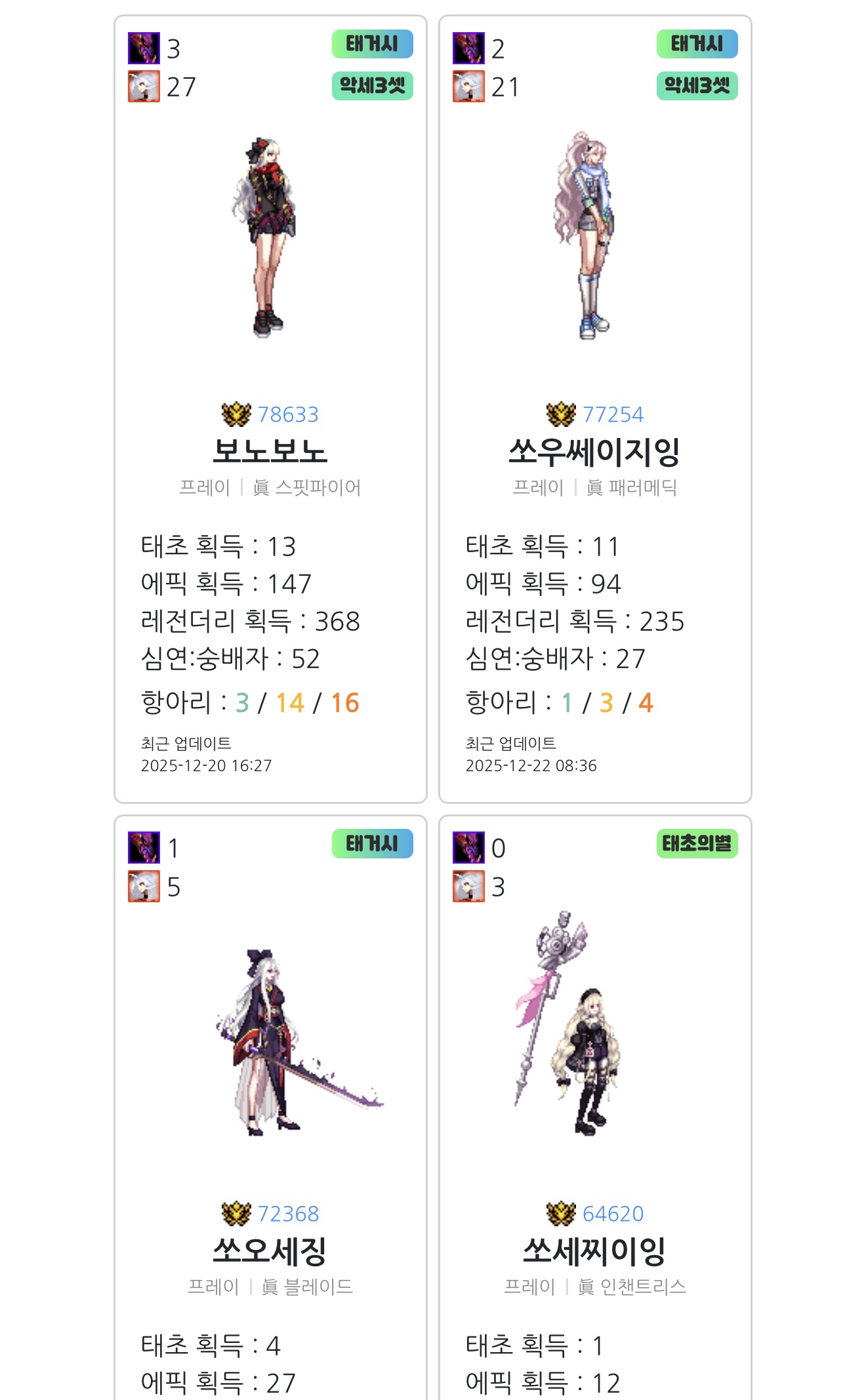 공지 [상시이벤트] 12월 묻고답하기 이벤트 안내 (11월 답변왕 발표) (10) 던전앤파이터 2025.12.11 2,965 0 공지 [수상자 발표] [월드보스] 정보/공략 작성 이벤트 수상자 안내 던전앤파이터 2025.12.04 3,640 0 공지 [이벤트] [디레지에] 레이드 정보/공략 작성 이벤트 던전앤파이터 2025.11.26 7,878 1 공지 2025 던파페스티벌 20th Anniversary 발표 요약 던전앤파이터 2025.11.22 207,586 23 공지 장비 / 플레이 / 뉴비 정보 모음 (219) 던전앤파이터 2025.04.24 999,999+ 115 공지 던전 공략 모음 (디레지에 레이드) (176) 던전앤파이터 2025.11.26 999,999+ 138 공지 전직 별 가이드 모음 (25/11/24 갱신) (745) 던전앤파이터 2025.11.24 999,999+ 391 수다 [공통] 디레 170억은 할만한데 150억은 대체.. (2) 글래머존 12:00 126 0 수다 [공통] 븜역 전개 헤카테 11:53 66 0 질문 [남레인저] 남렌 키울려고하는데 융합석은 레벨 (2) 오클로 11:50 60 0 수다 [공통] 과실 복구 문의 처리 됬는데 (1) 비질란테엔델 11:49 78 0 수다 [공통] 레이드 가기 너무 두렵다.. (106) 망고삐리 11:35 129,067 11 수다 [공통] ★밤나비★ 길드원 모집중// 디레 이내 길공o 단톡디코o 함께하실분을 모십니다. (7) 창단주 11:29 1,960 2 수다 [공통] 울멍 길드에서 길드원분들 모십니다!! 길드공대 운영 중!! 많관부!! 같이 즐겨요! (59) 솔랭거 11:27 132,897 8 팁 [공통] [디레지에] 레이드 실전 공략! 패턴은 영상 봤는데,, 포 타임 & 탭 타임은 어떻게 하지? (16) 지화자문금복 10:54 2,248 14 수다 [공통] 토요일 상황업무 보느라 하루 날려보니 남은 레이드가.. (1) 격투가(여) 10:54 142 0 수다 [공통] 떠오르는 신인 길드 하와왕&븜니찌와 길드원 모집중! [디레지에 가실 형님들 환영] 디코/카톡/톡방 ㅇ 지금 가입!! (3) 븜 10:53 29,415 2 수다 [엘레멘탈 마스터] 좋은아침 (1) 자귀나무 10:48 101 0 질문 [공통] 12.20 이번주 이내 강화몹 - 5시 흉터 Vernuses 10:22 110 1 수다 [공통] [설렘주의보] 길드원 모집중입니다~ (1) 흔들여신 10:15 533 1 수다 [공통] [모집] '디거시 - 요1도' <개꿀잼 오픈톡 맛보기 공개> (506) 싑고수 10:14 281,026 26 팁 [공통] 250/610 디레지에 벞교 빌드 다두 다시다뎌 10:07 169 1 수다 [공통] 오늘 생성해야 될 직업 스칼렛린치 10:03 229 0 수다 [공통] 길마가 동네북인 ''헐!'' 고인길드 녹아들기 힘드신분들!! /말 많으신 분,활발하신 분 대환영 냥담배 09:54 13,467 2 수다 [여넨마스터] 꼴등상인가..? (6) 비질란테엔델 09:48 316 1 질문 [공통] 다음달 피♡♥♥♡벤트 (2) _Gravity_ 09:44 180 0 수다 [공통] 키메라 바니바니 컷신 구매합니다 애몽룡 09:40 88 0