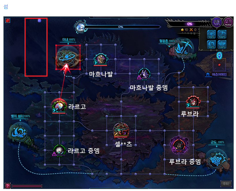-. 환요오괴 3마리는 레이드 시작시 4개의 섬으로 그냥 무조건 돌격 -> 어디가는진 랜덤 -. 맵을 열었을때 밑의 이미지처럼, 빨간 네모칸에 각파티 버퍼의 진각포, 1각포가 돌았는지 알 수 있음 -. 셀게이퍼는 1페 40% 밀면 2페열리고 입장해있던 1페 파티는 추방당함 -. 디레지에 1페 클리어시 섬체력 50% 회복