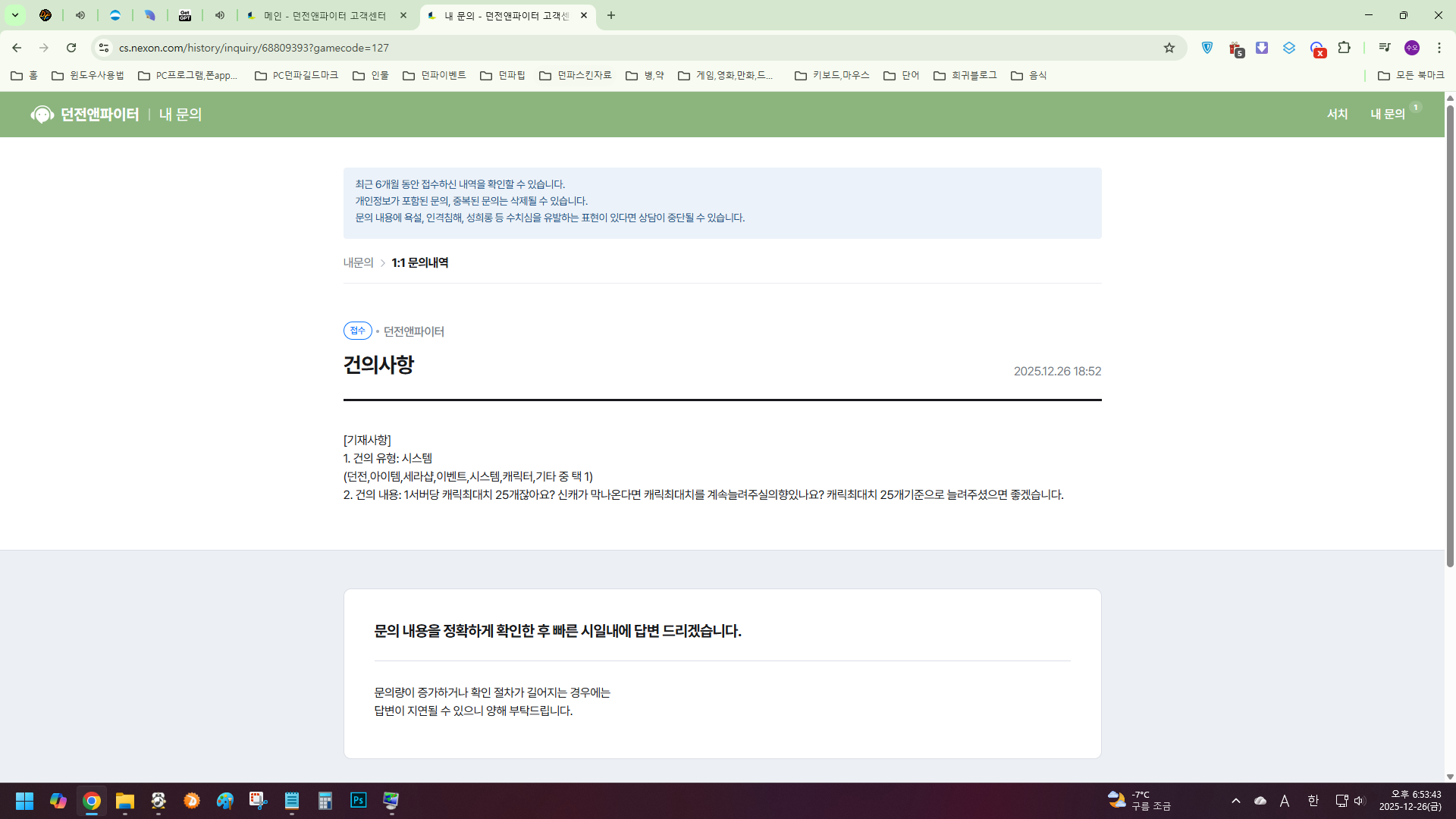 공지 [상시이벤트] 12월 묻고답하기 이벤트 안내 (11월 답변왕 발표) (10) 던전앤파이터 2025.12.11 3,487 0 공지 [수상자 발표] [월드보스] 정보/공략 작성 이벤트 수상자 안내 던전앤파이터 2025.12.04 4,101 0 공지 2025 던파페스티벌 20th Anniversary 발표 요약 던전앤파이터 2025.11.22 208,449 23 공지 장비 / 플레이 / 뉴비 정보 모음 (219) 던전앤파이터 2025.04.24 999,999+ 115 공지 던전 공략 모음 (디레지에 레이드) (177) 던전앤파이터 2025.11.26 999,999+ 139 공지 전직 별 가이드 모음 (25/12/24 갱신) (745) 던전앤파이터 2025.12.24 999,999+ 391 질문 [마도학자] 대왕파리채 질문드립니다 삐뮤냥 21:13 1 0 수다 [공통] [설렘주의보] 길드원 모집중입니다~ (1) 흔들여신 21:10 770 1 수다 [공통] ■하와왕&븜니찌와■길원모집! / 나무위키 공식인증길드 TOP20클리어 / 디레지에 길공보유 / 본섭에서함께할 랭커대환영 ! (49) 양초된다실시 20:49 806,201 23 수다 [공통] 레이드 가기 너무 두렵다.. (106) 망고삐리 20:47 130,203 12 수다 [공통] 시끌벅적한 [멜로디] 연합길드 길드원 모집! 단톡 디코 O / 디레지에 같이할사람 급구!! (19) 힉이 20:41 7,432 3 팁 [공통] [디레지에] 디레지에 핵심 보상,업그레이드소요시간 등 요약정리 (22) 뚜룹이헤카테 20:38 11,065 18 수다 [공통] 이거 버그임??? (2) 햡 20:36 74 0 수다 [공통] 토요일 오후1시30분 디레지에 가실분 모집합니다 (14) 안녕난블레 20:32 1,106 0 수다 [공통] 소환사 바니 컷씬 3300 2개 선 받고 팝니다 명월랑. 20:17 49 0 수다 [공통] ■생로랑■길드원 모집!_[중천창설 전체2위]_디레지에 헤딩 길공운영_대형길드_뉴비,복귀대환영_디레지에ON (10) 콥듀란 20:15 63,202 3 수다 [공통] 에픽항아리 (1) 악질마법소녀 20:01 99 0 수다 [공통] [모집] 매우 큰 속보;;;;;;;;;;;;;; <개꿀잼 오픈톡 맛보기 공개> (515) 싑고수 19:42 282,528 26 질문 [공통] 형들 담주 본캐무기깡vs부캐무기깡 질문있어요 (4) mpno.1 19:26 111 0 수다 [공통] 건의사항 (5) 식스여크 18:56 167 0 수다 [공통] ★밤나비★ 길드원 모집중// 디레 이내 길공o 단톡디코o 함께하실분을 모십니다. (5) 창단주 18:55 2,222 3 팁 [공통] [디레지에] 파장 잘해요! 누구나 쉽게 이해하는 실전 운영 공략 #포타임 #파장꿀팁 #종언vs재앙 #씨앗관리 #모든빌드 (1) 솜나나 18:52 629 3 수다 [공통] 현재 시즌에서 박종민 디렉터의 설계에 놀랬음. 스칼렛린치 18:51 150 1 수다 [공통] 세리아와 함께한 20주년 선물 경품이 정말 안오는것 같은데... (4) 스칼렛린치 18:48 173 0 수다 [공통] 하루 일과 끝 (4) 지우 18:47 139 0 수다 [공통] "길드원이 길마를 납치해서 코스프레 시키는 길드가 있다고?ㅋㅋ 그런곳이 어딨ㅇ" ◀ 바른먹거리 ▶ 길드원 모집중! ★=★ (252) Xenevie 18:29 63,307 21