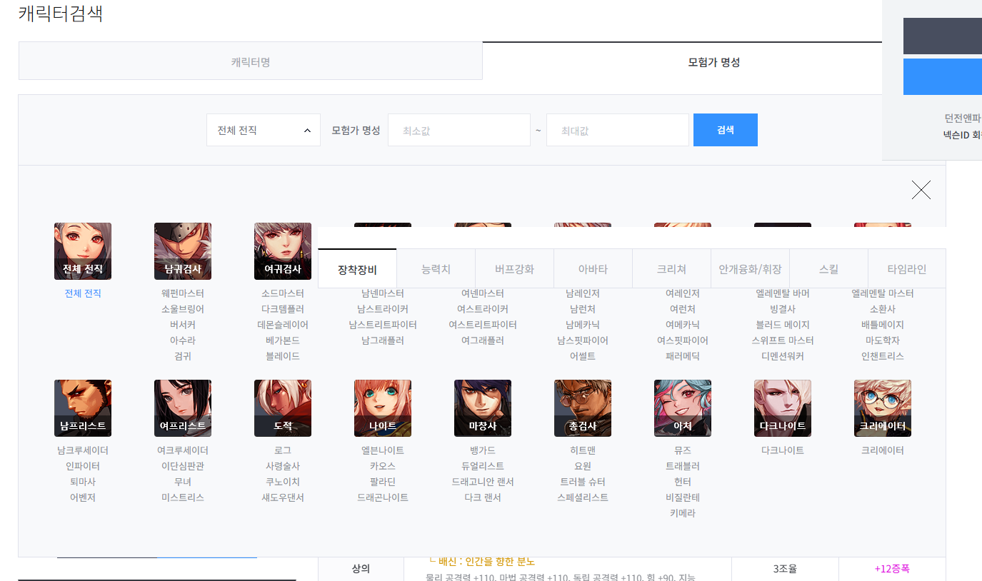 보기 전직 1차 각성 2차 각성 전체 전직 전체 전직 귀검사(남) 웨펀마스터 소울브링어 버서커 아수라 검귀 귀검사(여) 소드마스터 다크템플러 데몬슬레이어 베가본드 블레이드 격투가(남) 남넨마스터 남스트라이커 남스트리트파이터 남그래플러 격투가(여) 여넨마스터 여스트라이커 여스트리트파이터 여그래플러 거너(남) 남레인저 남런처 남메카닉 남스핏파이어 어썰트 거너(여) 여레인저 여런처 여메카닉 여스핏파이어 패러메딕 마법사(남) 엘레멘탈 바머 빙결사 블러드 메이지 스위프트 마스터 디멘션워커 마법사(여) 엘레멘탈 마스터 소환사 배틀메이지 마도학자 인챈트리스 프리스트(남) 남크루세이더 인파이터 퇴마사 어벤저 프리스트(여) 여크루세이더 이단심판관 무녀 미스트리스 도적 로그 사령술사 쿠노이치 섀도우댄서 나이트 엘븐나이트 카오스 팔라딘 드래곤나이트 마창사 뱅가드 듀얼리스트 드래고니안 랜서 다크 랜서 총검사 히트맨 요원 트러블 슈터 스페셜리스트 아처 뮤즈 트래블러 헌터 비질란테 키메라 다크나이트 다크나이트 크리에이터 크리에이터 공통 공통
