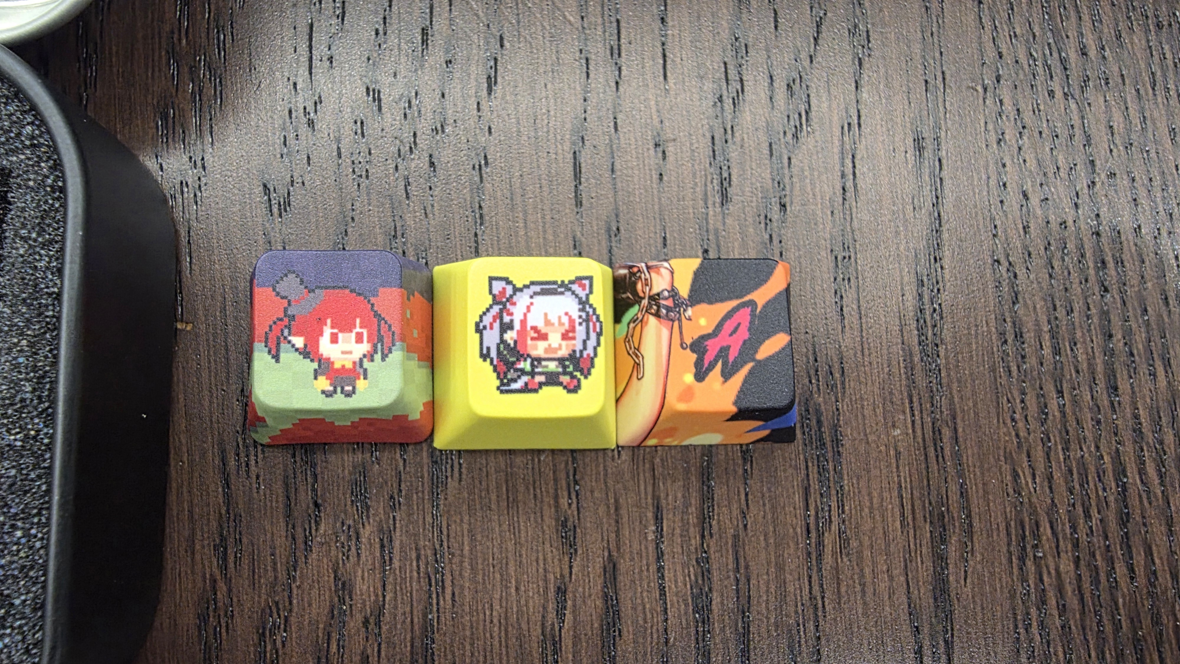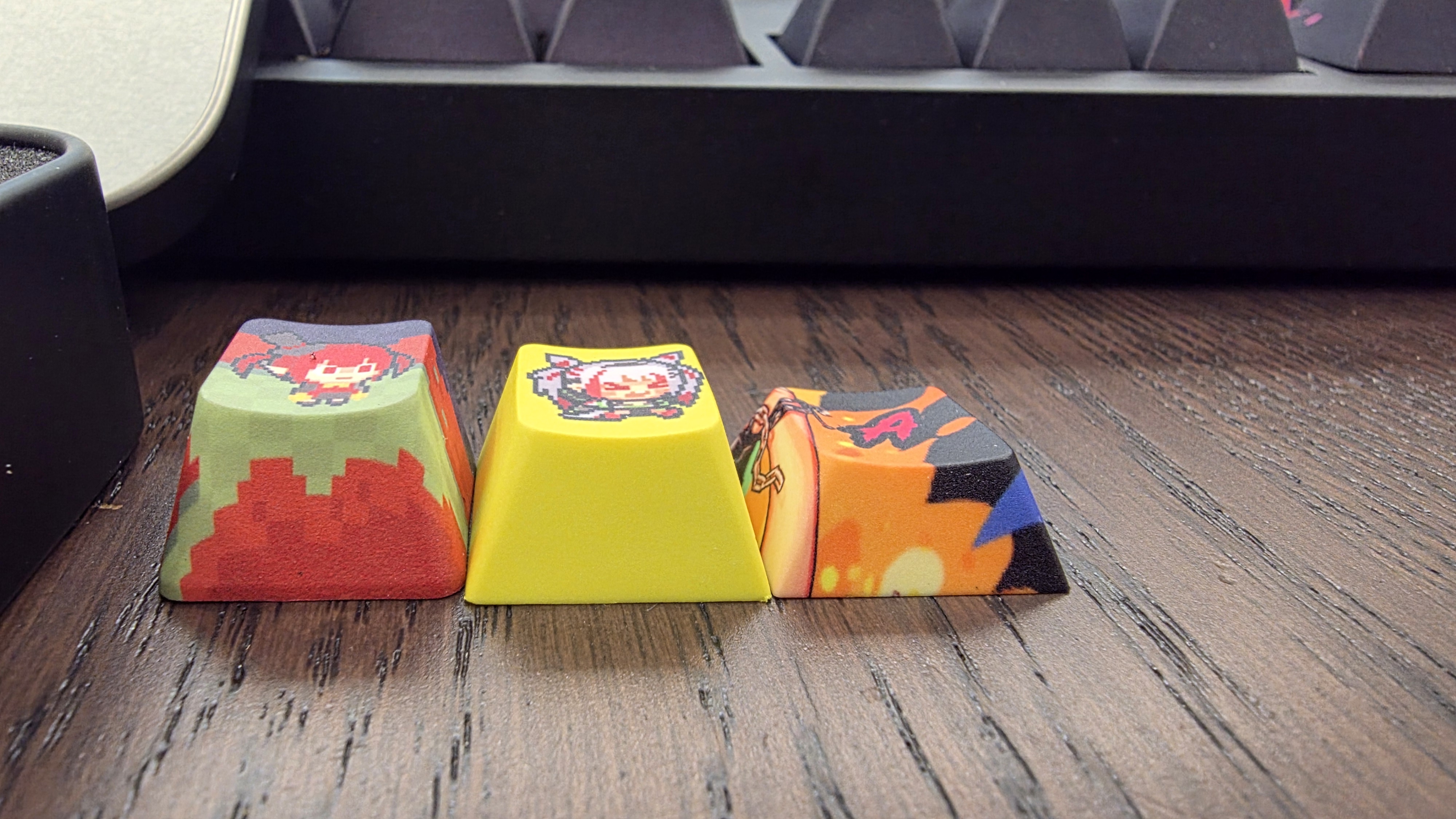 왼쪽 : 20주년 기념 키캡, 중간 : 20주년 키보드 특전 키캡, 오른쪽 : 20주년 키보드 A키