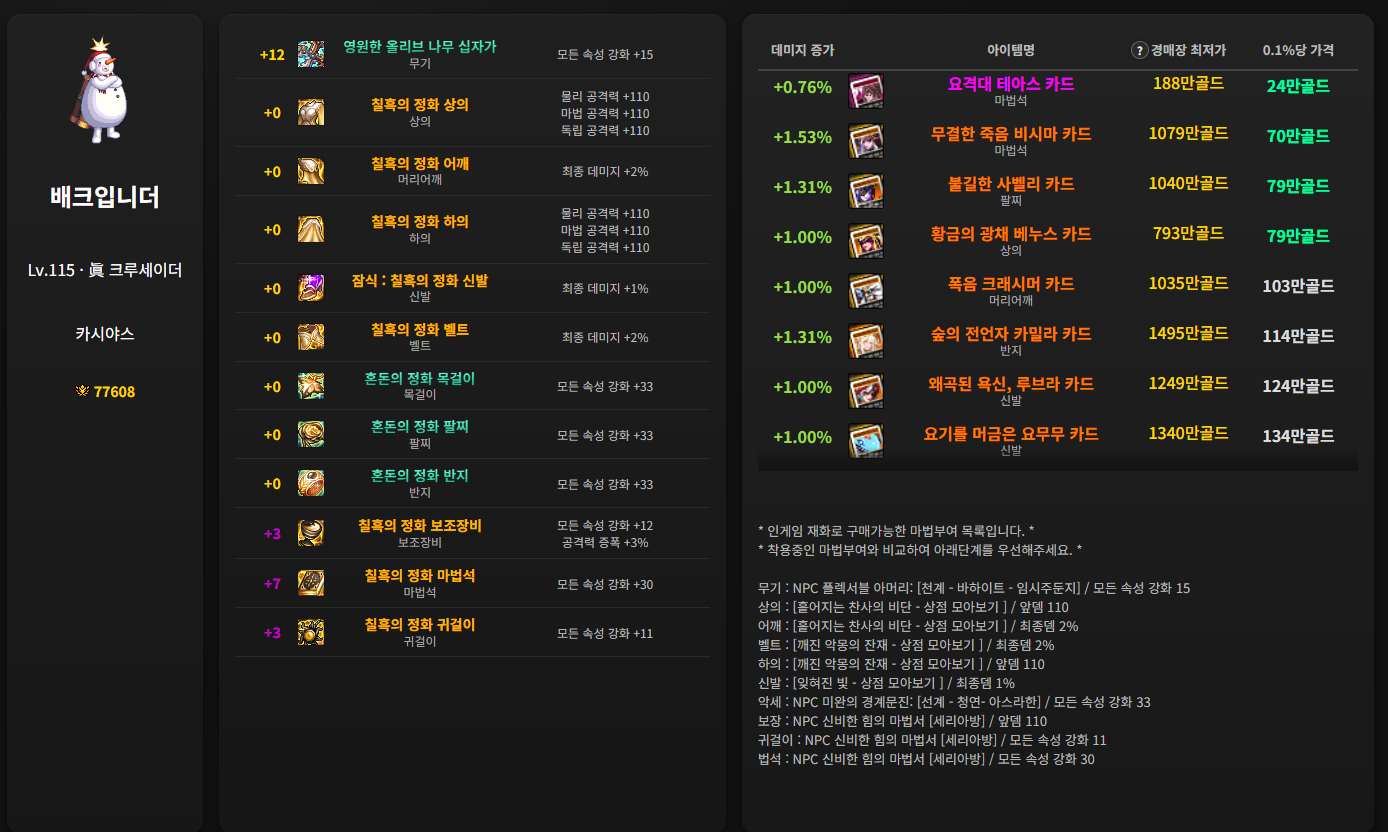 해당 캐릭터의 남은 마법부여중에서. 가장 가성비가 좋은 순서대로 확인가능한 사이트입니다.