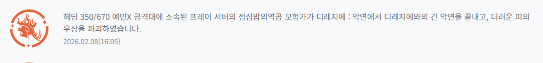 공지 [상시이벤트] 1월 묻고답하기 이벤트 안내 (12월 답변왕 발표 / 진 답변왕 인장 지급 안내) 던전앤파이터 2026.01.08 6,764 5 공지 [수상자 발표] [디레지에] 레이드 정보/공략 작성 이벤트 수상자 안내 던전앤파이터 2026.01.08 6,517 0 공지 2025 던파페스티벌 20th Anniversary 발표 요약 던전앤파이터 2025.11.22 218,383 24 공지 장비 / 플레이 / 뉴비 정보 모음 (222) 던전앤파이터 2025.04.24 999,999+ 116 공지 던전 공략 모음 (디레지에 레이드) (180) 던전앤파이터 2025.11.26 999,999+ 141 공지 전직 별 가이드 모음 (25/02/05 갱신) (754) 던전앤파이터 2026.02.05 999,999+ 397 수다 [공통] [모집] 던파 길드 [소중] 소중한 가족 분들을 모십니다. (42) 먹츄 01:10 18,005 5 질문 [여크루세이더] 세라핌 태거시 질문입니다! (2) 리미레인저 01:02 34 0 수다 [공통] 디레지에 야생공대는 아직도 빌드가 정형화 안됐네 (1) *디멘션워커 00:57 54 0 팁 [공통] 악연 클리어 행복합니다. / 350 각몰 런처 성불 (4) 평민버섴 00:53 292 1 질문 [남런처] 디레 경매주화 첨 먹어보는데 (1) 아앜공습경보 00:53 66 0 질문 [여크루세이더] 여우셋으론 올11증 해도 680만을 못넘나여? (2) Sir.요하네스 00:51 64 0 질문 [남레인저] 까마귀 성님들 여기서 400억찍으려면 뭐 해야 돼여? (7) Sir.요하네스 00:36 101 0 질문 [공통] 재앙지에 패턴 연습 혼자 하는 방법 아시는분? 젠 00:31 80 0 수다 [공통] 그런가아 캔슬하슈 00:27 107 0 수다 [웨펀마스터] 목표했던 악연클 했으니 쉬다오던지 탈던하던지 해야겠네요. (2) 혜신 00:06 169 1 수다 [공통] 던파6개월하면서 바라는점 TX-45A-team 00:04 160 0 토론 [공통] 스킬창 UI/UX개선 및 던파 AI 쪽지 기능이 강화를 건의합니다. 하이븜 2026.02.08 100 0 수다 [공통] 노전직 복귀유저 태거시 먹고 위엄 컨텐츠 끝! [귀검사] 2026.02.08 149 0 수다 [공통] [한마음길드] 던린이/던짱/복귀자/수다/정보공유환영! 단란한소규모길드입니다 :) (32) 유우후! 2026.02.08 8,749 3 수다 [공통] 무리 해라가 보이네요. 타마모☆캣 2026.02.08 151 0 수다 [남레인저] 디레솔플인데? 스뎅와루바시 2026.02.08 225 0 수다 [공통] 먼 같잖은걸로 다 시비터네 (4) ShiraiKuroko 2026.02.08 318 0 수다 [공통] [모집] 길드원들이 '악연 8클' 초고수 길마에게 수치심을 주네요;; <개꿀잼 오픈톡 맛보기 공개> (590) 싑고수 2026.02.08 290,562 28