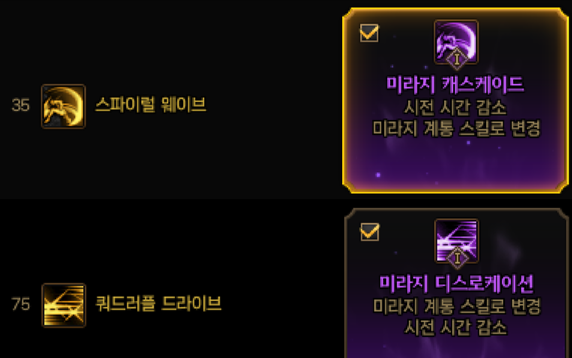 VP 개화를 통해 35제 스킬인 스파이럴 웨이브와 75제 스킬인 쿼드러플 드라이브를 미라지 종류로 변경시킬 수 있습니다.
