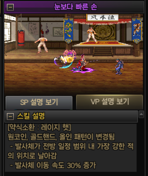 체술과의 차이점은 일부 체술들 대표적으로 대난투 / 검충 / 파성추 등을 채용하지않고 그 SP로 소환수를 채용하는 방식입니다.
