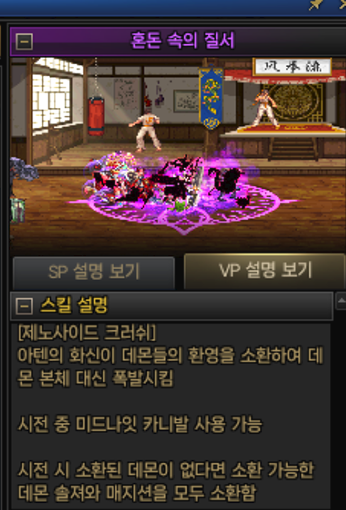 4. 제노사이드 - VP2를 반드시 필수적으로 채용해야합니다. " 설명중에 환영을 소환하여 데몬 본체 대신 폭발 " 이 부분이 중요한데 환영 생성시 소환수의 활동상태를 캔슬시킵니다.
