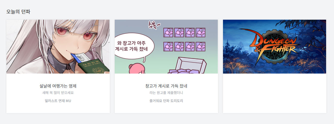 공지 [상시이벤트] 2월 묻고답하기 이벤트 안내 (1월 답변왕 발표) 던전앤파이터 2026.02.12 2,588 0 공지 [공통] 내 전직 가이드 작성/갱신 이벤트 (2/12 ~ 2/26) (7) 던전앤파이터 2026.02.12 3,285 2 공지 2025 던파페스티벌 20th Anniversary 발표 요약 던전앤파이터 2025.11.22 220,952 25 공지 장비 / 플레이 / 뉴비 정보 모음 (222) 던전앤파이터 2025.04.24 999,999+ 117 공지 던전 공략 모음 (디레지에 레이드) (182) 던전앤파이터 2025.11.26 999,999+ 142 공지 전직 별 가이드 모음 (25/02/13 갱신) (755) 던전앤파이터 2026.02.13 999,999+ 398 수다 [공통] 이게맞나... 이단심판관 00:00 16 0 수다 [공통] [모집] 던파 길드 [소중] 소중한 가족 분들을 모십니다. (46) 먹츄 2026.02.17 20,075 6 수다 [공통] 2주차 악연은 스무스하게 클리어했네 치즈퐁듀치킨 2026.02.17 22 0 수다 [공통] ♡아깽이♡ 길드 집사들 구함니다 =^._.^= (46) churr 2026.02.17 33,555 12 질문 [공통] 뉴비가 질문 드려여~ (3) 조화지경 2026.02.17 56 0 팁 [패러메딕] [패러메딕] 딜러인듯 딜러아닌 패러메딕 운용 가이드(최신화 완료) (306) 백랑월 2026.02.17 286,924 129 질문 [공통] 계승 질문요 (2) 버섯..커? 2026.02.17 79 0 팁 [여스트라이커] 타격감 손맛 쾌감! 여 스트라이커 가이드 백서 - 중천 v6.6 : 디거시 및 검은질병 무기 관련 계산 추가 (494) 백랑월 2026.02.17 759,424 181 질문 [공통] 안개신 레이드 버티기 질문 드립니다.. (3) 몽월 2026.02.17 167 0 수다 [공통] [공통] [하와왕]디거시먹고 비틱이 하고싶으셨다고요? 악연 길공 및 각종 레이드 길공 운영중@ 던파고인물들과 게임즐기실분 (5) youno1 2026.02.17 2,718 1 수다 [공통] 던파가 지금 해야될 것들 개인적인 생각 끄적여 봄 (5) 카르마리턴즈 2026.02.17 554 2 수다 [공통] 멜로디[루바토&레가토&테누토&바이엘] 나벨 혼자가기 외롭다? 이내도 혼자가기 무섭다? 뉴비길드도 있다구 헤딩팟어때? (12) 칸나의노예 2026.02.17 15,664 2 수다 [공통] 바니바니 블레이드 1,2차 각성 컷신 쿠폰 팝니다. 콘링 2026.02.17 226 0 질문 [공통] 버서커/소울 둘중 쉬운직업이 무엇일까요..? (7) 엘마없쥬 2026.02.17 162 0 수다 [공통] 설날에 오던 올릴게 없었나보네 (1) 헌터A팔케 2026.02.17 189 0 수다 [공통] 20주년 키보드 쿠폰 1억 골드에 판매합니다. KITSUNE 2026.02.17 94 0 수다 [공통] "찰나"에서 길드원 모집! / 단톡디코o / 디레지에 4캐릭 이상 / 악연 가능자 환영 (4) 도권 2026.02.17 58,681 3 질문 [공통] 마도 태거시 질문! (5) 빙염의마도사 2026.02.17 128 0 수다 [공통] 『포근한아이들』길드에서 길드원을 모집합니다. 화니아버지 2026.02.17 81,472 0 수다 [공통] ■생로랑■길드원 모집!_[★악연/디레 업둥,조율길공운영]_[디코활발/방송길공]_대형길드_뉴비,복귀대환영 (16) 콥듀란 2026.02.17 68,133 4