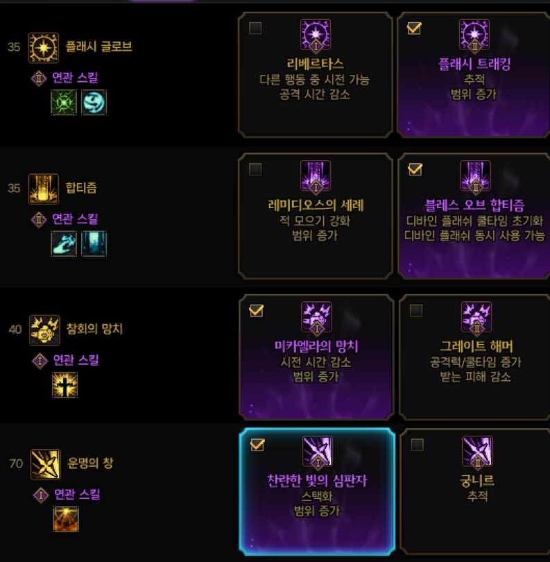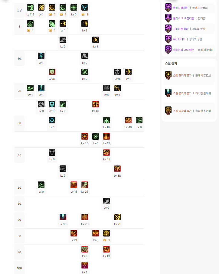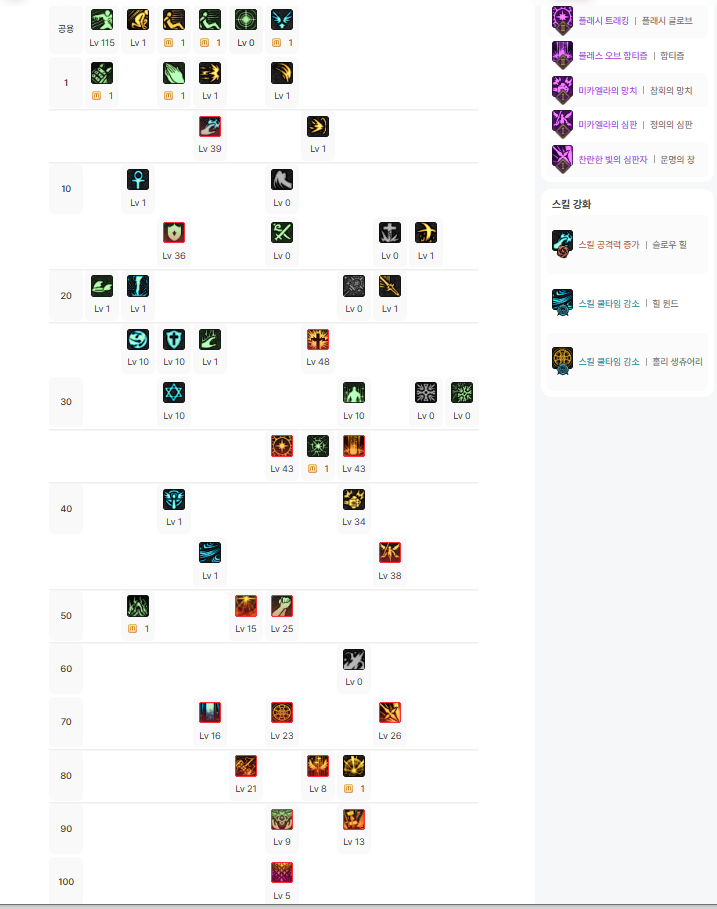 각성기 쿨감 VP를 빼고 버프 레벨을 낮추는 등 솔로 플레이에 조금 더 최적화된 스킬 트리입니다.