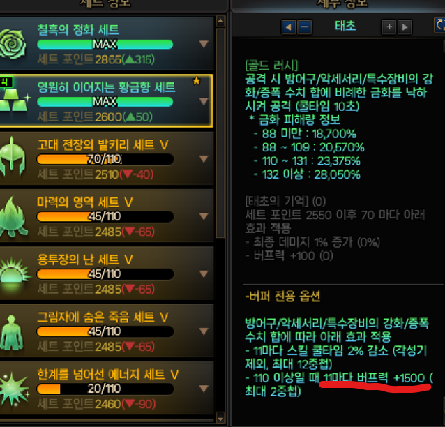 11증폭 위로는 태초 악세사리가 없고 세트 포인트가 부족하더라도 황금향을 사용해주세요.
