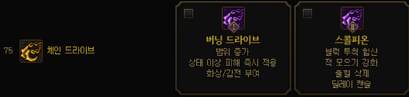 vp1. 버닝드라이브 - 범위가 증가하고 기존의 출혈 + 화상,감전을 부여하기 때문에 체인 드라이브만으로도 3상변을 쉽게 묻힐수있어
