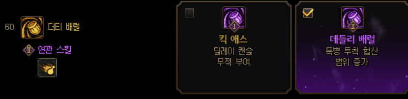 1. 독병투척 - 기본으로 던질 경우 독과 화상을 부여합니다. 강화투척은 넓은 범위에 독을 퍼뜨리니 숭배자를 돌거나 잡몹정리할떄 좋습니다.