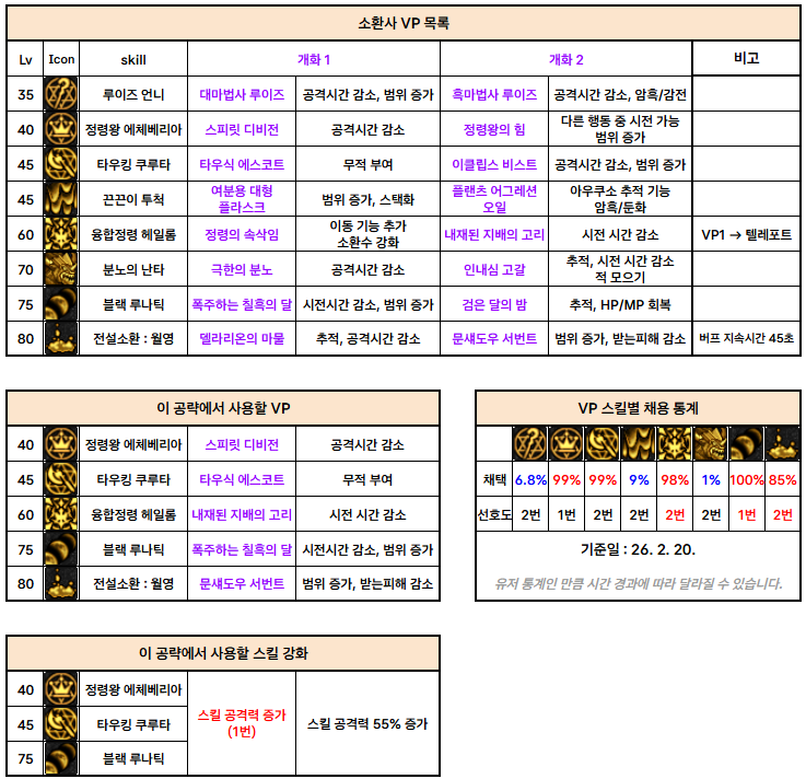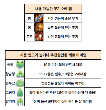 소환사의 경우 아이템 세팅에 제약이 많기 때문에, 추천 표를 따로 만들었습니다.