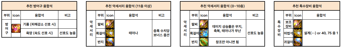 악세서리 융합석 : 11증 이상은 테아나, 10증 이하는 테아나, 축복 위주로 파밍