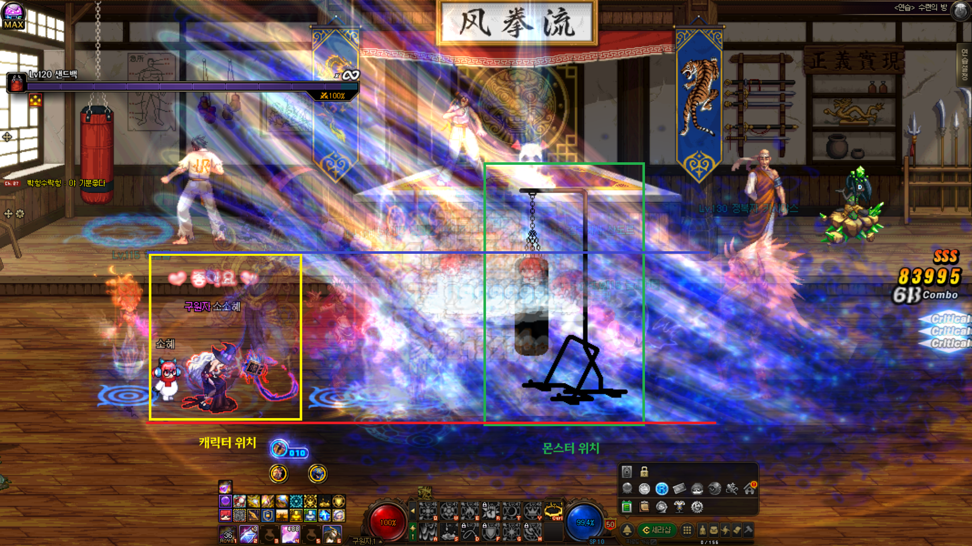 소환사의 기본적인 운영법은 몬스터와의 가로축을 맞춘 후 매스 텔레포트, 끈끈이 투척 등으로 소환수의 지속 공격을 유도/유지 한 후에, 교감 스킬(소환수 공격 스킬)과 액티브 스킬을 쓰시면 됩니다. 생각보다 세로축 스킬이 잘 없기 때문에 이렇게 하시면 스킬 맞추기가 조금 쉽습니다.