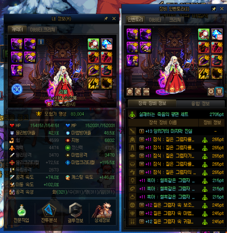 아바타는 위 그림과 같이 하면 됩니다. 크리티컬이 많이 남으면 상의, 하의를 듀얼(지능+크리티컬) 엠블렘을 사용하셔도 됩니다.
