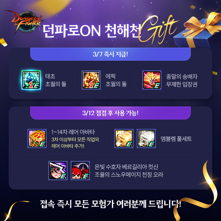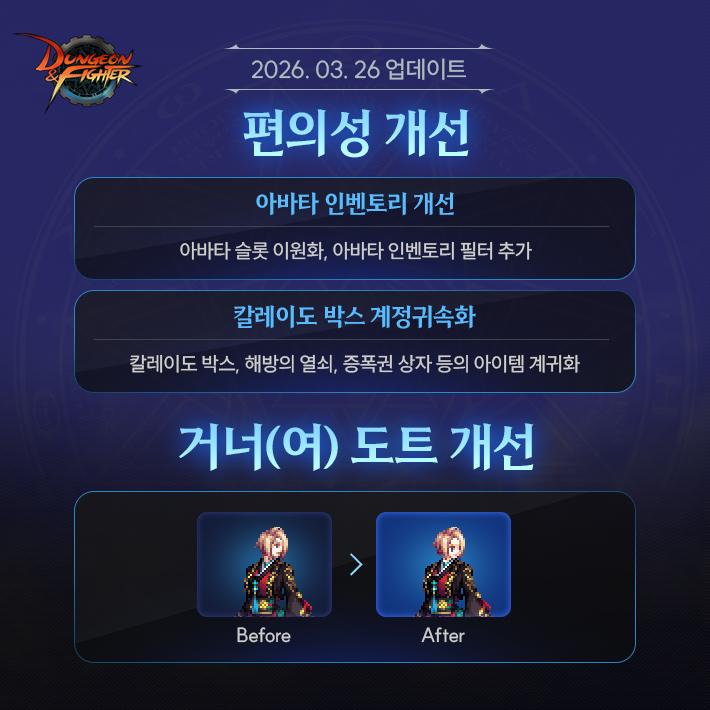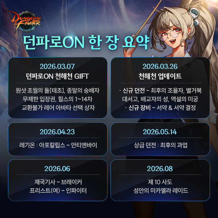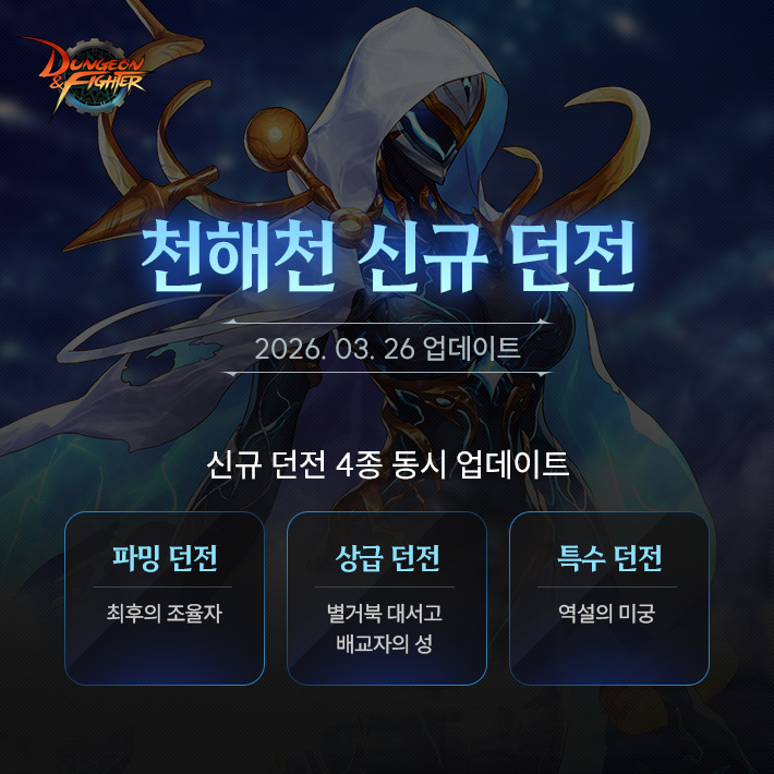 공지 던파로ON : 천해천 발표 요약 던전앤파이터 2026.03.07 17,430 14 공지 [상시이벤트] 3월 묻고답하기 이벤트 안내 (2월 답변왕 발표) 던전앤파이터 2026.03.12 3,475 0 공지 [수상자 발표] 내 전직 가이드 작성/갱신 이벤트 수상자 안내 던전앤파이터 2026.03.05 5,049 5 공지 [이벤트] 천해천 공략 이벤트 (3) 던전앤파이터 2026.03.11 4,737 0 공지 장비 / 플레이 / 뉴비 정보 모음 (223) 던전앤파이터 2025.04.24 999,999+ 120 공지 던전 공략 모음 (디레지에 레이드) (186) 던전앤파이터 2025.11.26 999,999+ 143 공지 전직 별 가이드 모음 (26/03/03 갱신) (765) 던전앤파이터 2026.02.27 999,999+ 400 질문 [공통] 혹시 fc온라인도 하시는분 있나요? TO구원자TO 05:16 110 0 질문 [공통] 남귀검 직업들 질문 (4) DKT헤이 00:28 276 0 질문 [공통] 오늘 라방 어땠나요?? (7) MMOMMO 00:28 677 0 질문 [공통] 혹시 모험가의 의지 스킬칭호를 초월의 돌[칭호]로 옮길 수가 있나영? (1) obbayasalldo 00:03 242 0 질문 [공통] 서약 중복 안된다는게 (3) 속리산고라니 2026.03.20 471 0 질문 [뮤즈] 안뇽하세용 오늘 시작했는데 길드 (11) 몽글찌 2026.03.20 595 0 질문 [아수라] 답 없네 진짜 어쩔수없니 2026.03.20 169 0 질문 [공통] 그니까 서약결정은 꽝이 없으니 태거시보다 확률이 높다는거잖나? (1) 먼지가된다 2026.03.20 217 0 질문 [공통] 몇년만에 복귀한 던린이 질문있습니다! (16) 날아라조경주 2026.03.20 388 0 질문 [공통] 방송 연습을 ♡♥♥♡ 방송 켜서 하시네요? 창녕양파 2026.03.20 121 0 질문 [공통] ㅋㅋㅋㅋㅋㅋㅋㅋㅋㅋㅋㅋ핫하다해서 왓는데 진짜핫하네 양상추 2026.03.20 225 0 질문 [공통] 라이브방송 맞음..? 뭐임이게???????? (3) 와드를넣어요 2026.03.20 194 1 질문 [공통] 예>??????????????????????????? 이러고 끝이라고요?????? (2) 애니래온하트 2026.03.20 90 0 질문 [공통] 베누스 나벨 융합석 에픽업글 안하는게 나은가요?? (3) 붉은물방울 2026.03.20 241 0 질문 [공통] 천해천 시작되면 고유 융합석 변환서는 없어지나요?? (3) 미헬멜처 2026.03.20 322 0 질문 [공통] 벞린이 세라핌 버프력올리기 질문드립니다! (5) 리미레인저 2026.03.20 215 0 질문 [검귀] 검귀 물크 낮추는법.. (5) 정빈이 2026.03.20 327 0 질문 [블레이드] 물크가 대검 태거시를 껴도 120인데 낮추는법 없나요? (3) 정빈이 2026.03.20 209 0 질문 [엘레멘탈 바머] 이동속도 올려주는 노하우 알려주세요 (9) 민아소진혜리 2026.03.20 286 0 질문 [공통] 고유융합석으로 바꿔주는 레전결정은 모든셋트공용임? (3) 쪼이 2026.03.20 373 0