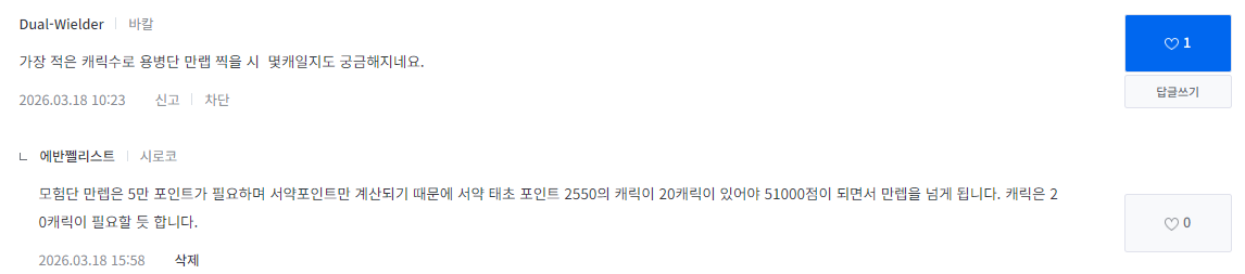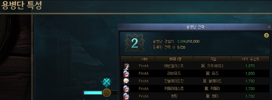 용병단 레벨은 서약포인트가 있는 캐릭들의 서약포인트 합으로 경험치가 쌓이며 20캐릭까지 등록할 수 있습니다.