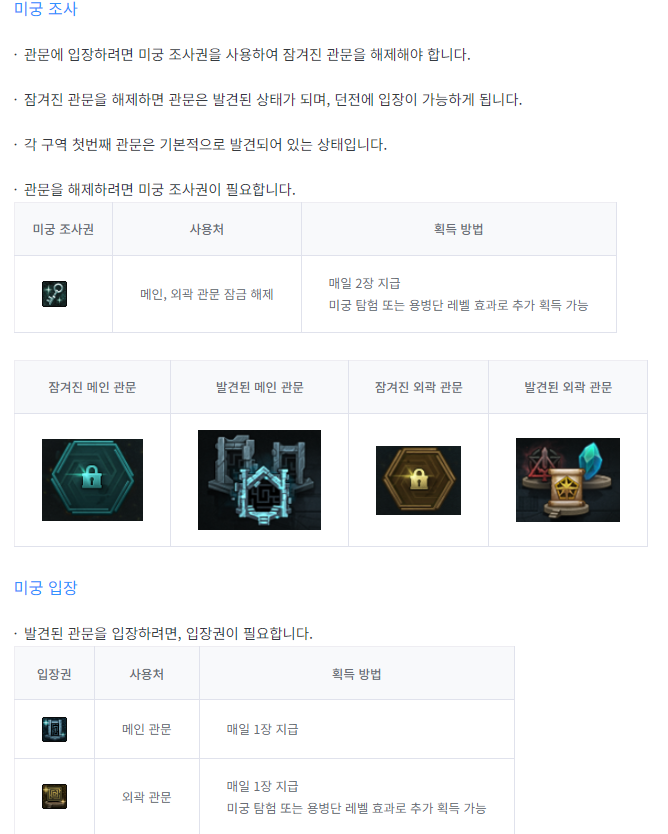 모든 관문들은 열쇠모양의 미궁조사권 1개를 써야 확인할 수 있으며