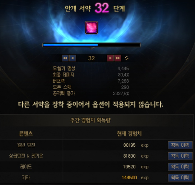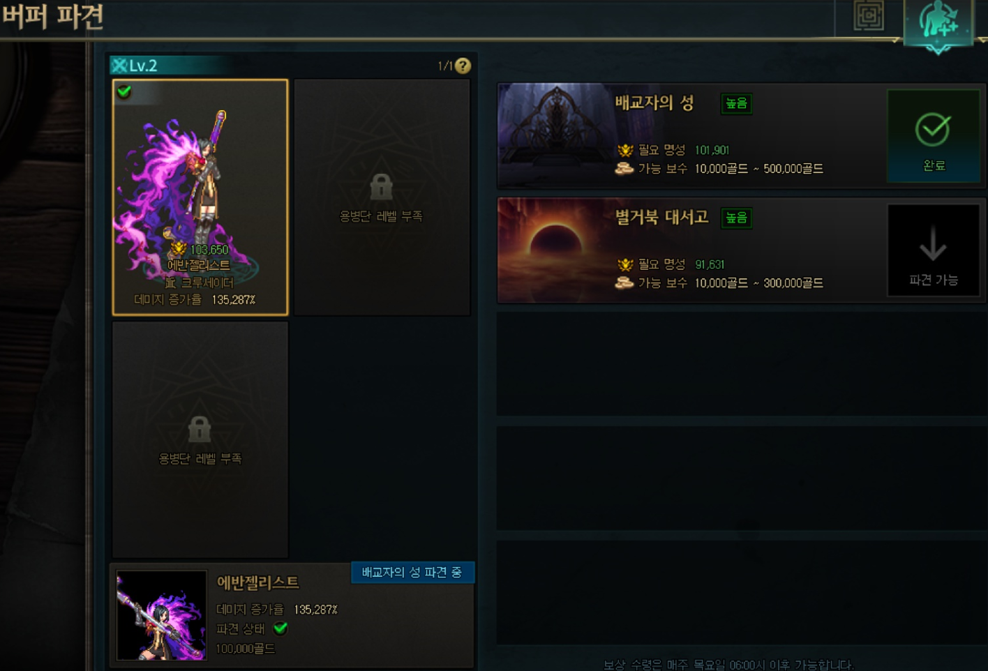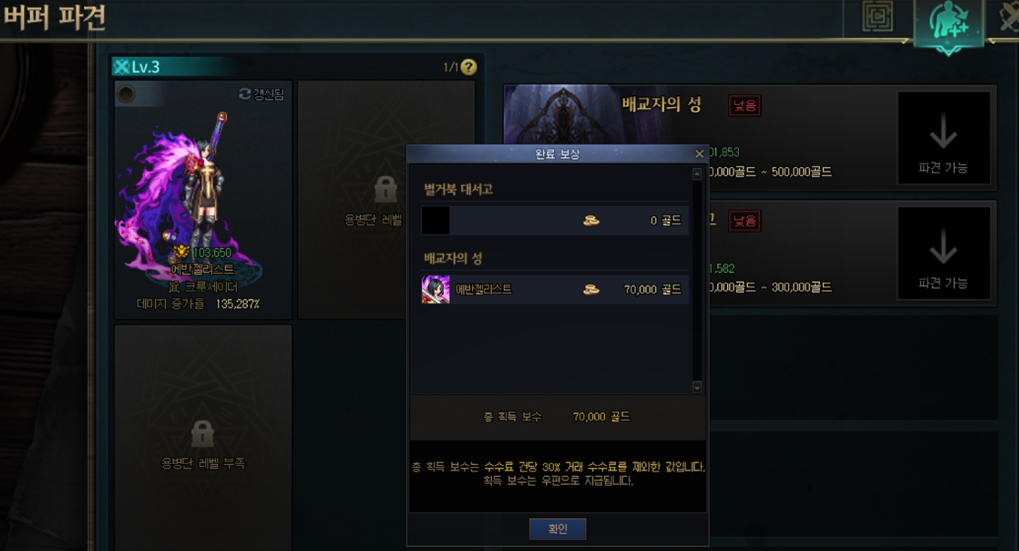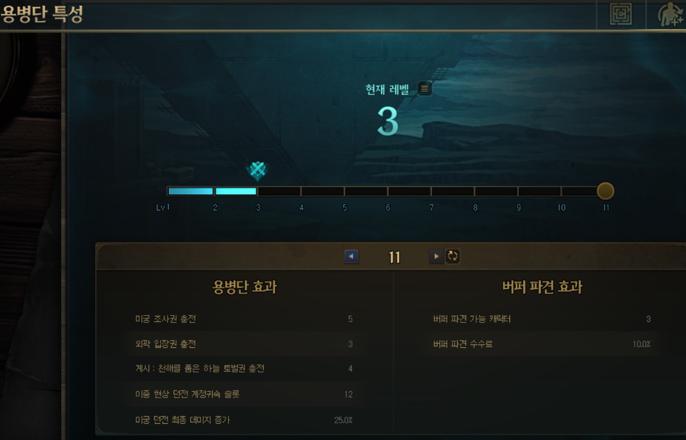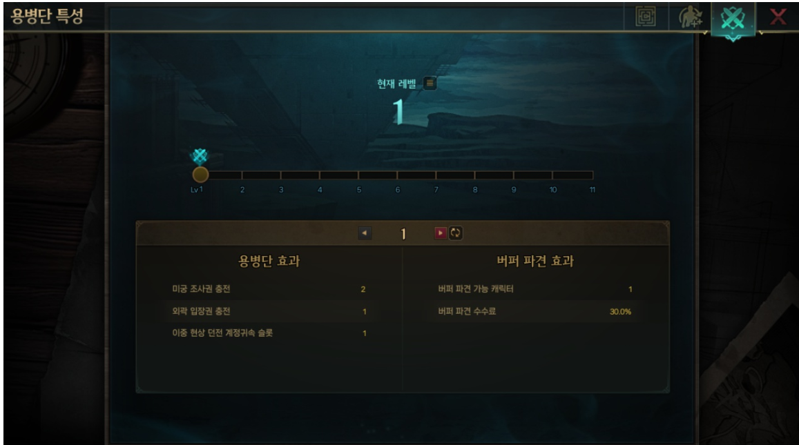용병단 레벨에 따라 용병단 효과, 버퍼 파견 효과를 확장할 수 있습니다.
