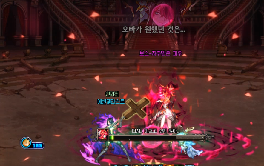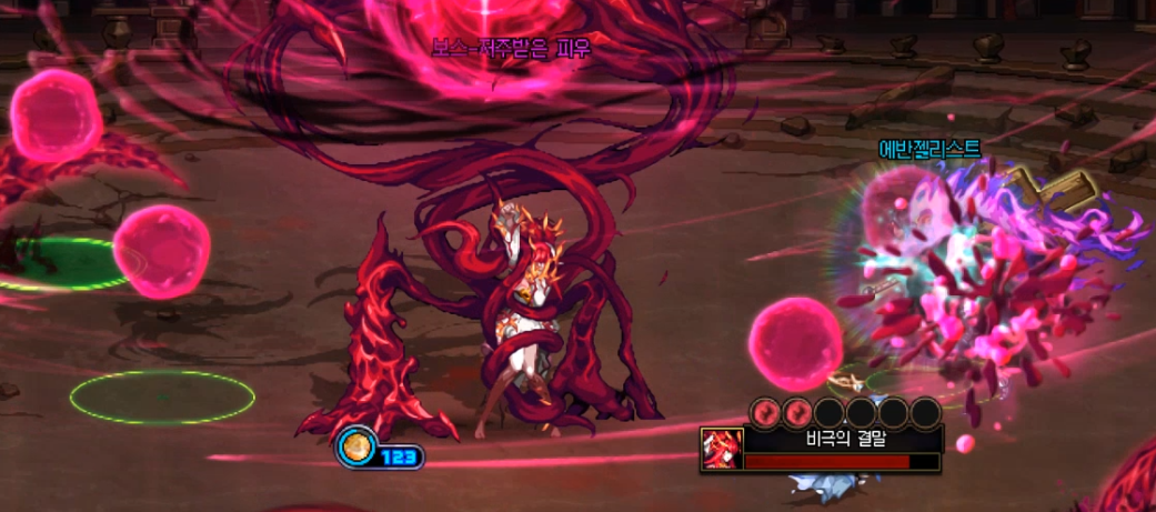비극의 결말 패턴입니다. 체력이 급격히 빠르게 사라지며 바닥에 많은 피구슬이 생깁니다. 피구슬 아래의 녹색원이 가득차면 피우가 구슬을 가져갑니다.